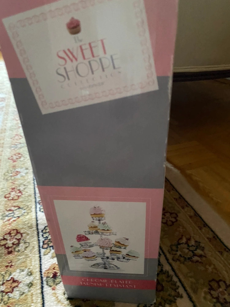 The Sweet Shoppe Revolving 4 tier silver cupcake stand. Please see details on the box in the photos. Great gift/addition for the baker out there. Comes in the box ready to be gifted just in time for Valentine’s Day. High quality item. Displays your cupcakes beautifully on an attractive stand.