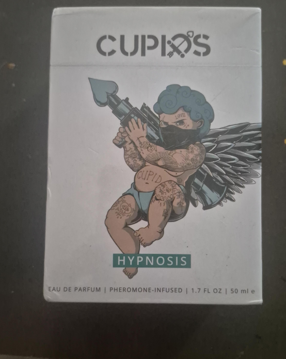 The box features an illustration of a cupid with tattoos and wings. It has text on the front about the product. You'll love the scent, it's a real mood booster.