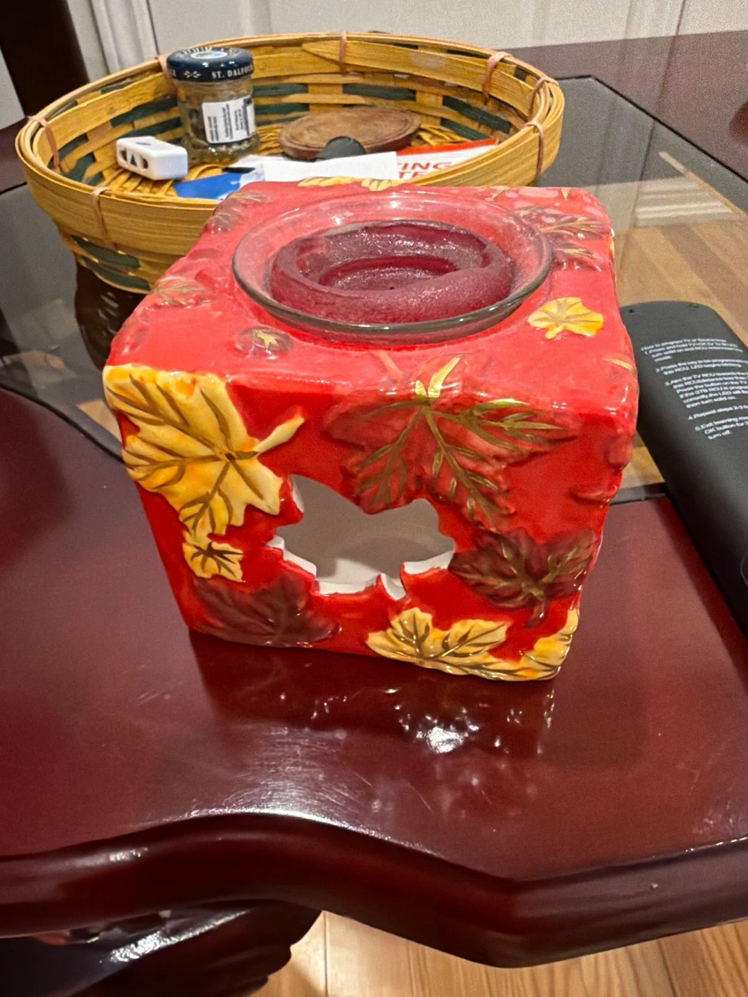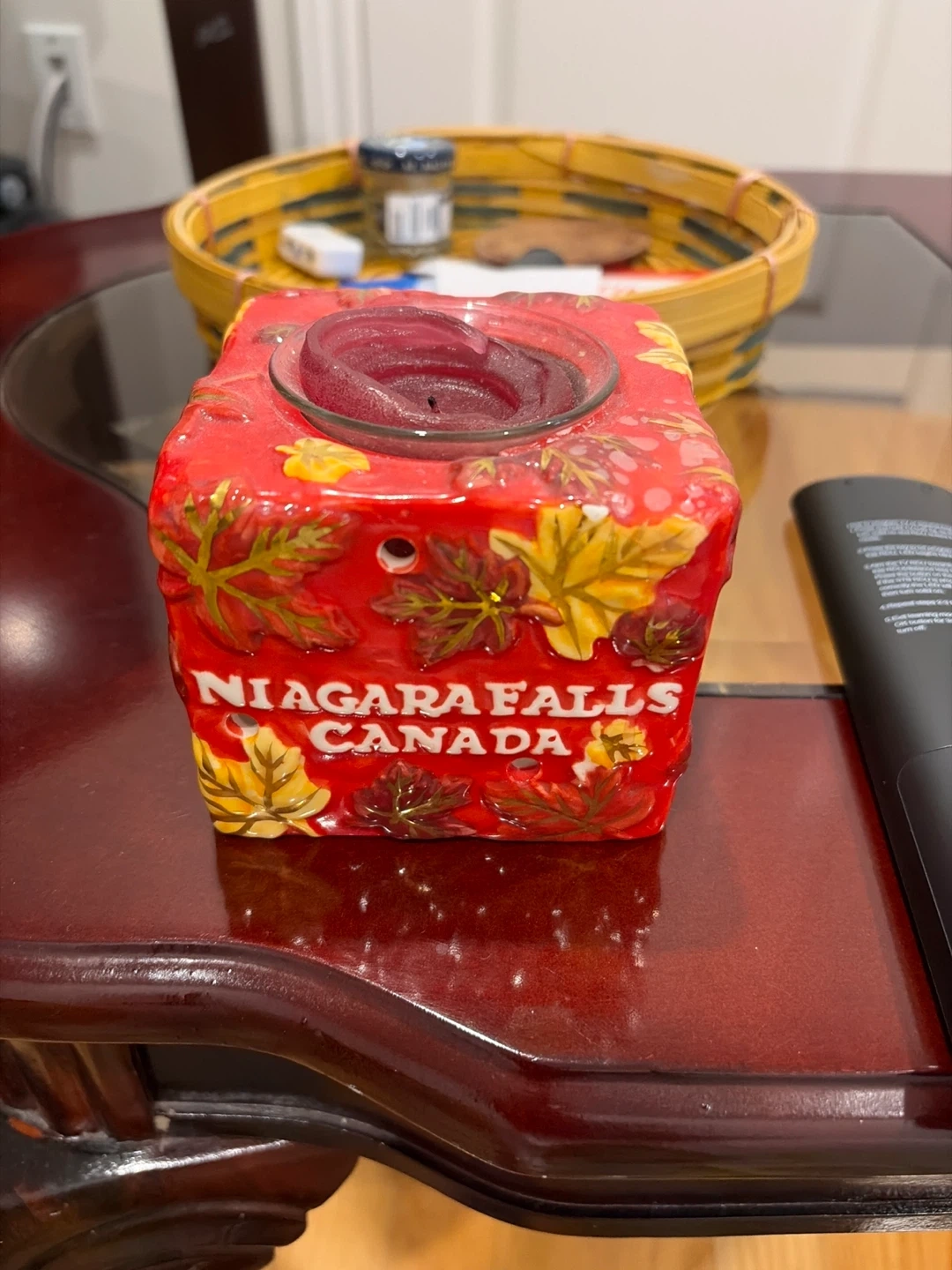 Ceramic oil burner featuring a Niagara Falls Canada design with maple leaves. It has a glass dish on top for essential oils. This piece is great for adding a decorative touch and pleasant scents to your home.
