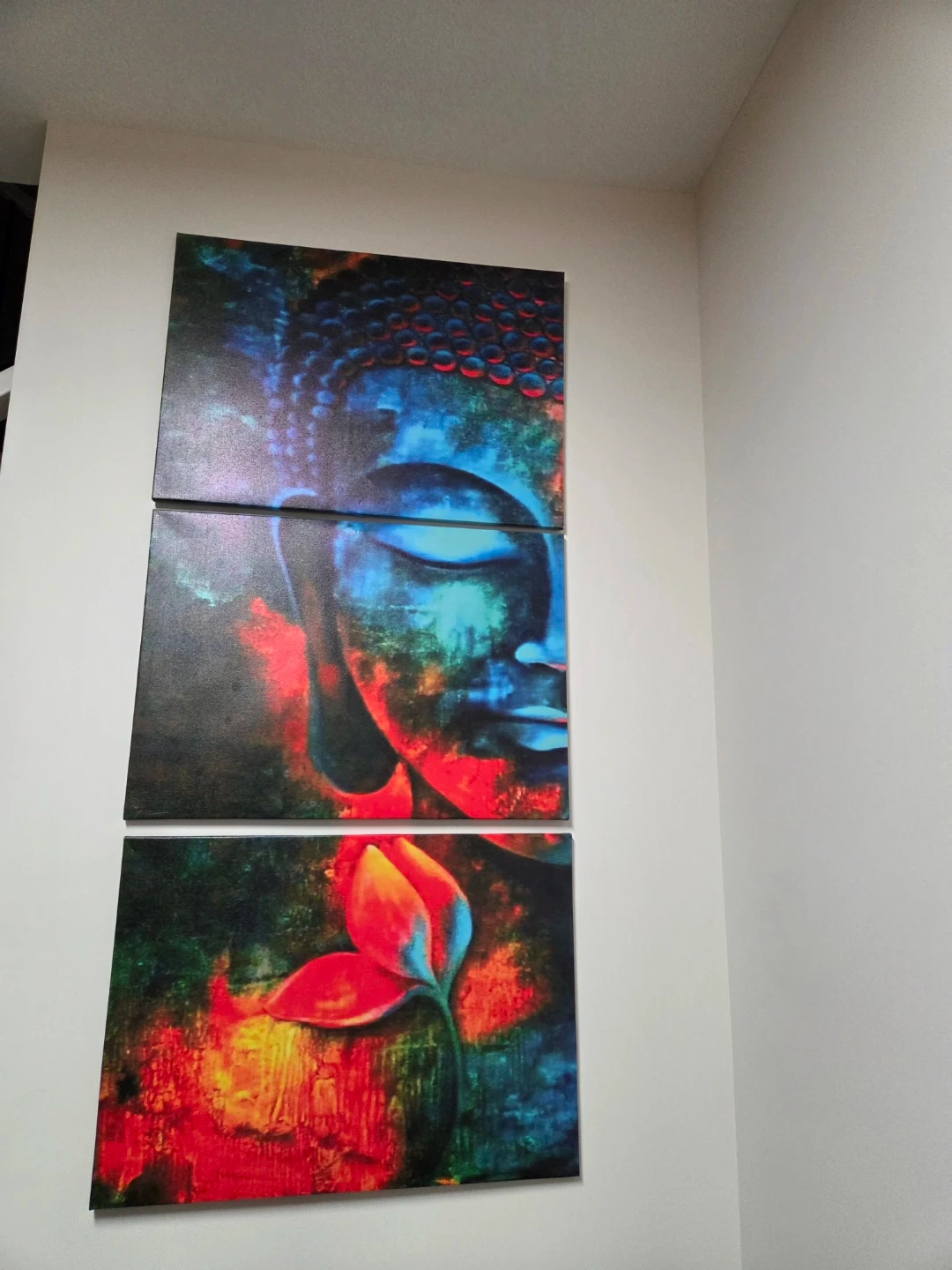 Selling a vibrant Buddha canvas wall art set! It comes with three panels that create a striking image when hung together. The artwork features a mix of blues, reds, and greens, making it a colourful addition to any room