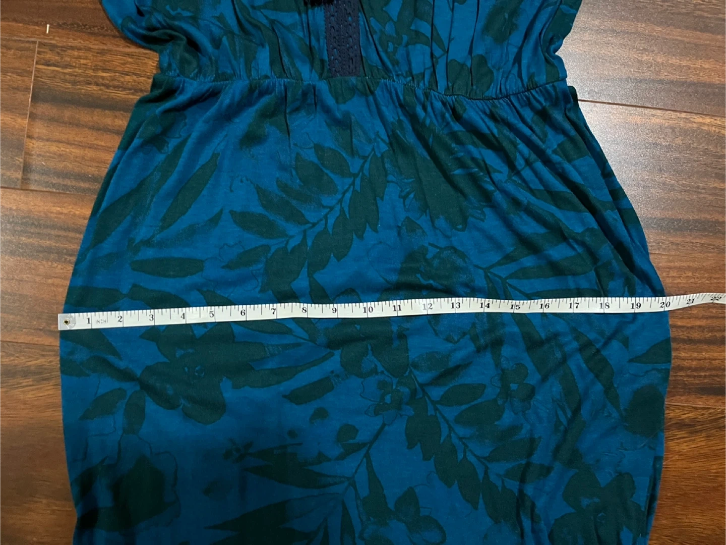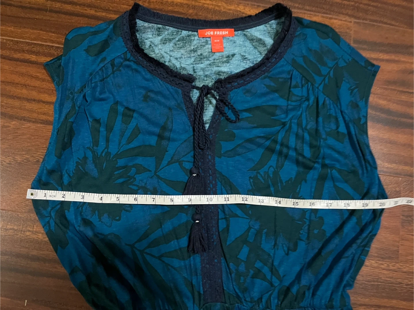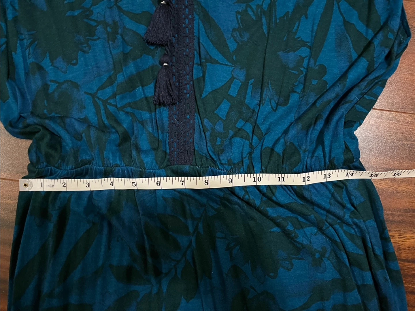 Beautiful Joe Fresh midi dress in teal blue with dark green tropical leaf design. Sleeveless with keyhole neckline, tassel tie, and embroidery detail. Elasticized waist for a flattering fit. Lightweight 100% rayon fabric makes it ideal for warm weather.