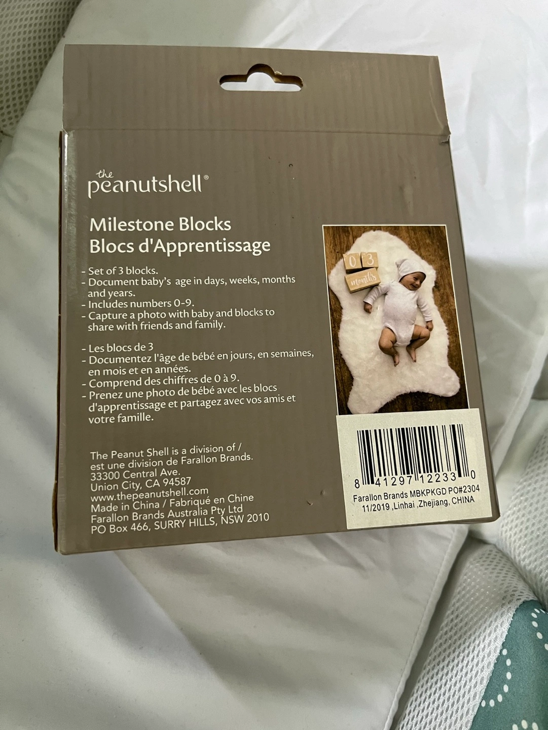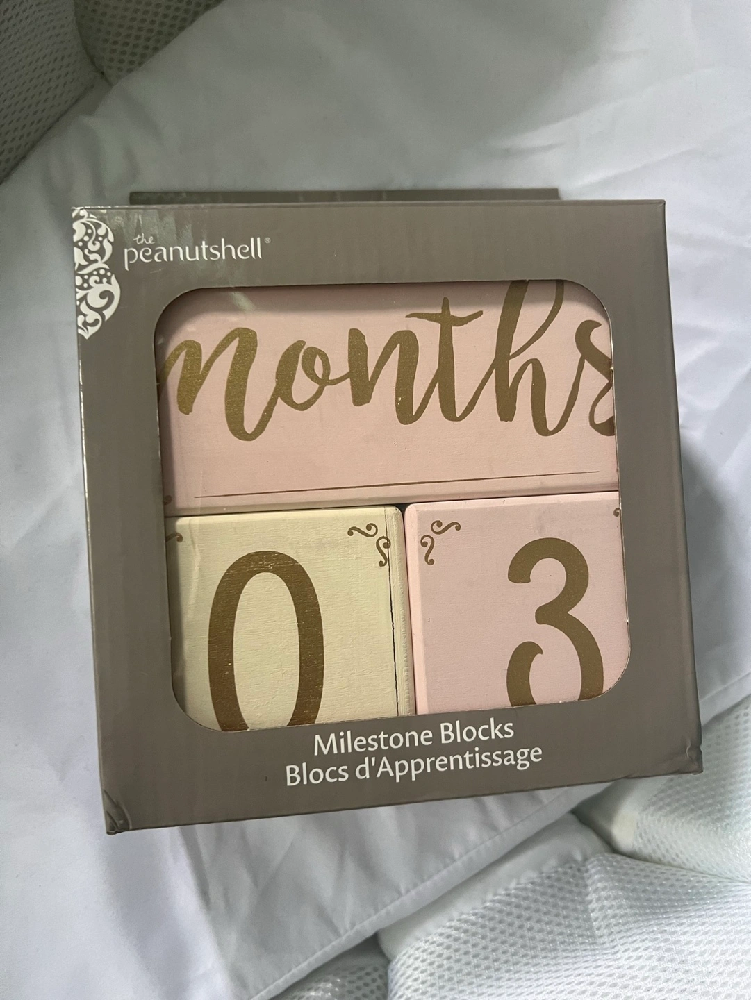 Set of 3 wooden blocks. Numbers 0-9. Document baby's age in days, weeks, months and years. Capture photos with baby and blocks. Share with friends and family. Pink and beige blocks with gold lettering.