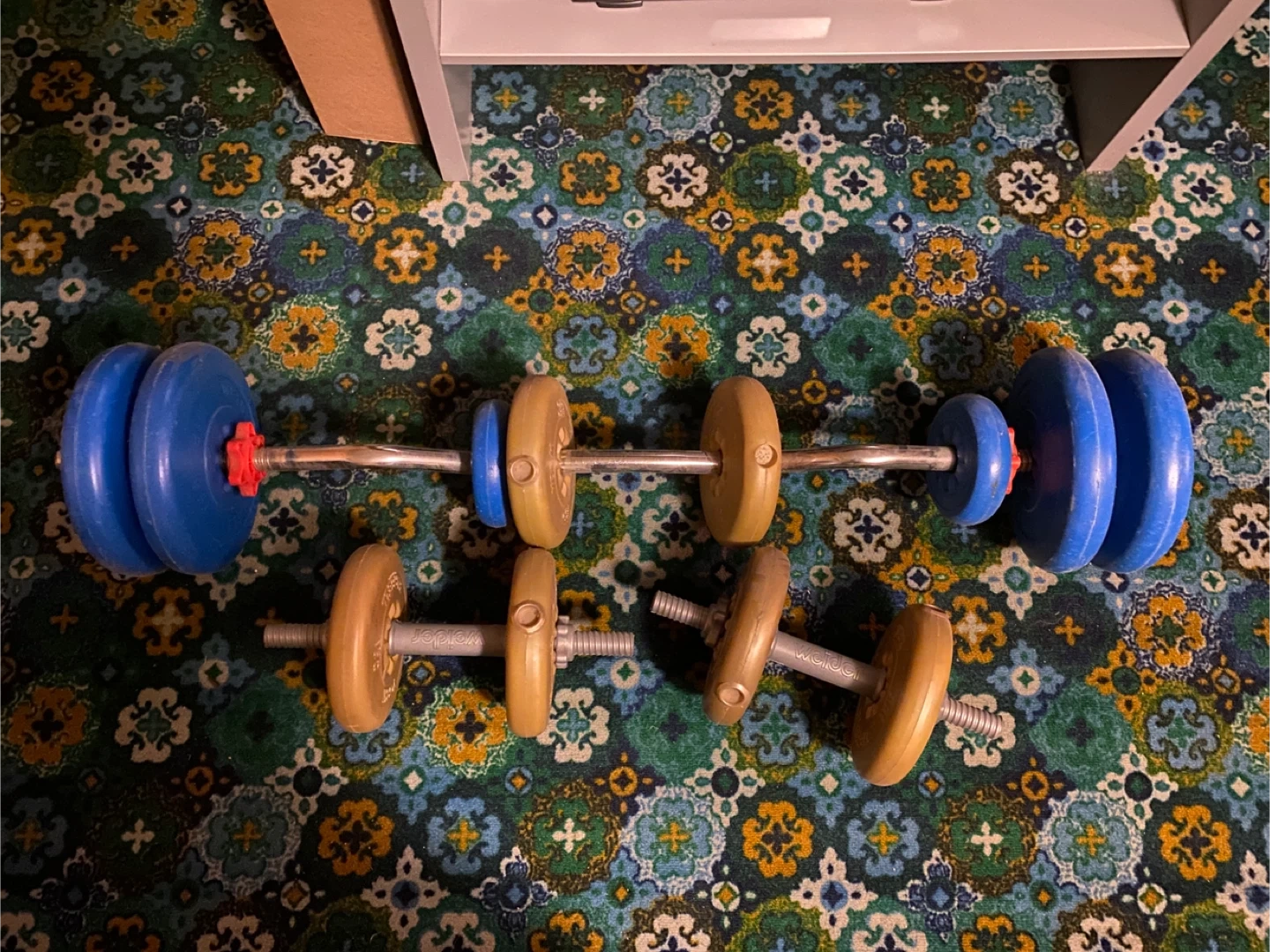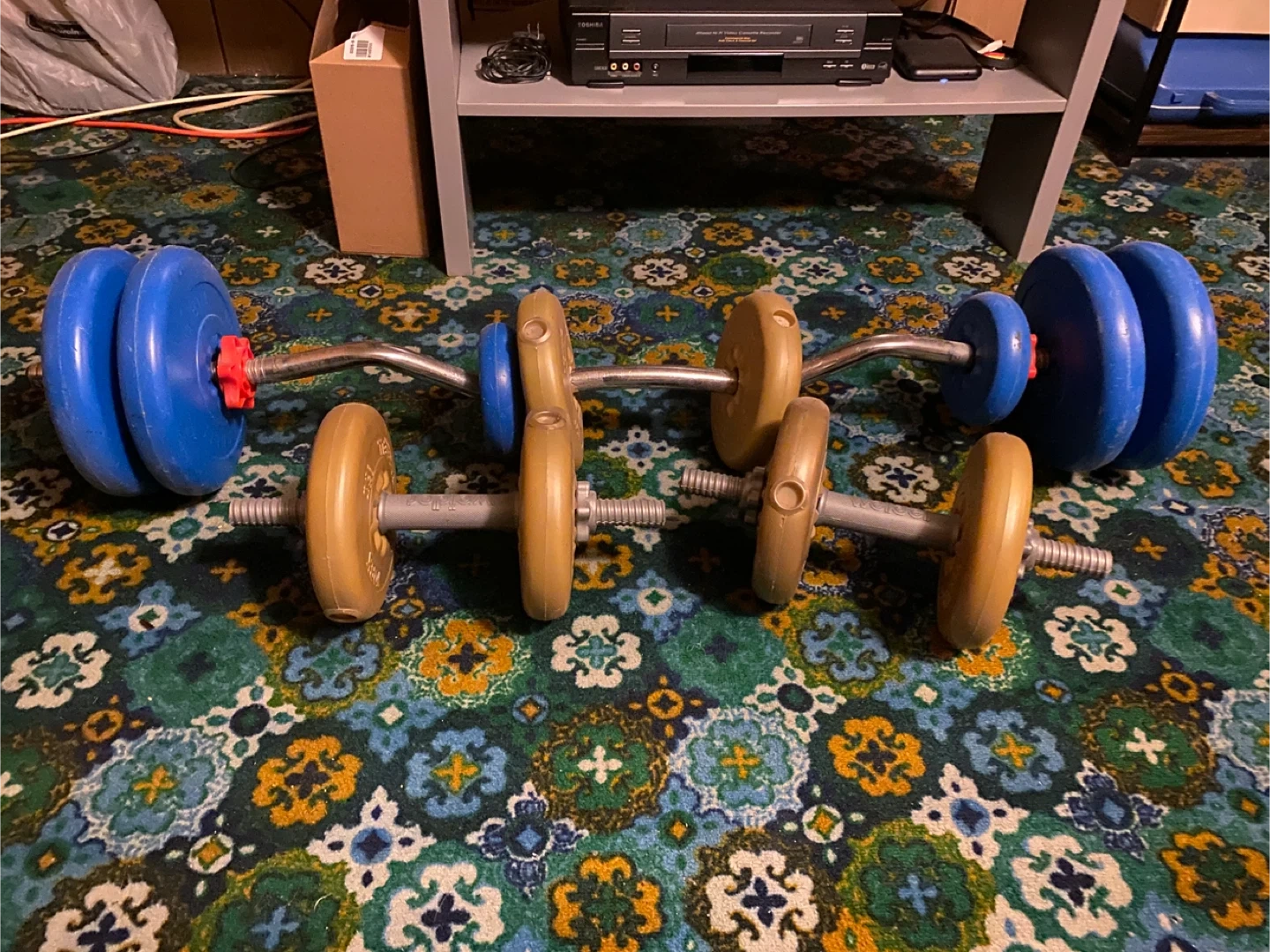 238Selling a curling bar dumbbell set in used condition. Great for home workouts! Adjust the weights according to your needs easily switching weights. From 5lbs to 75lbs.