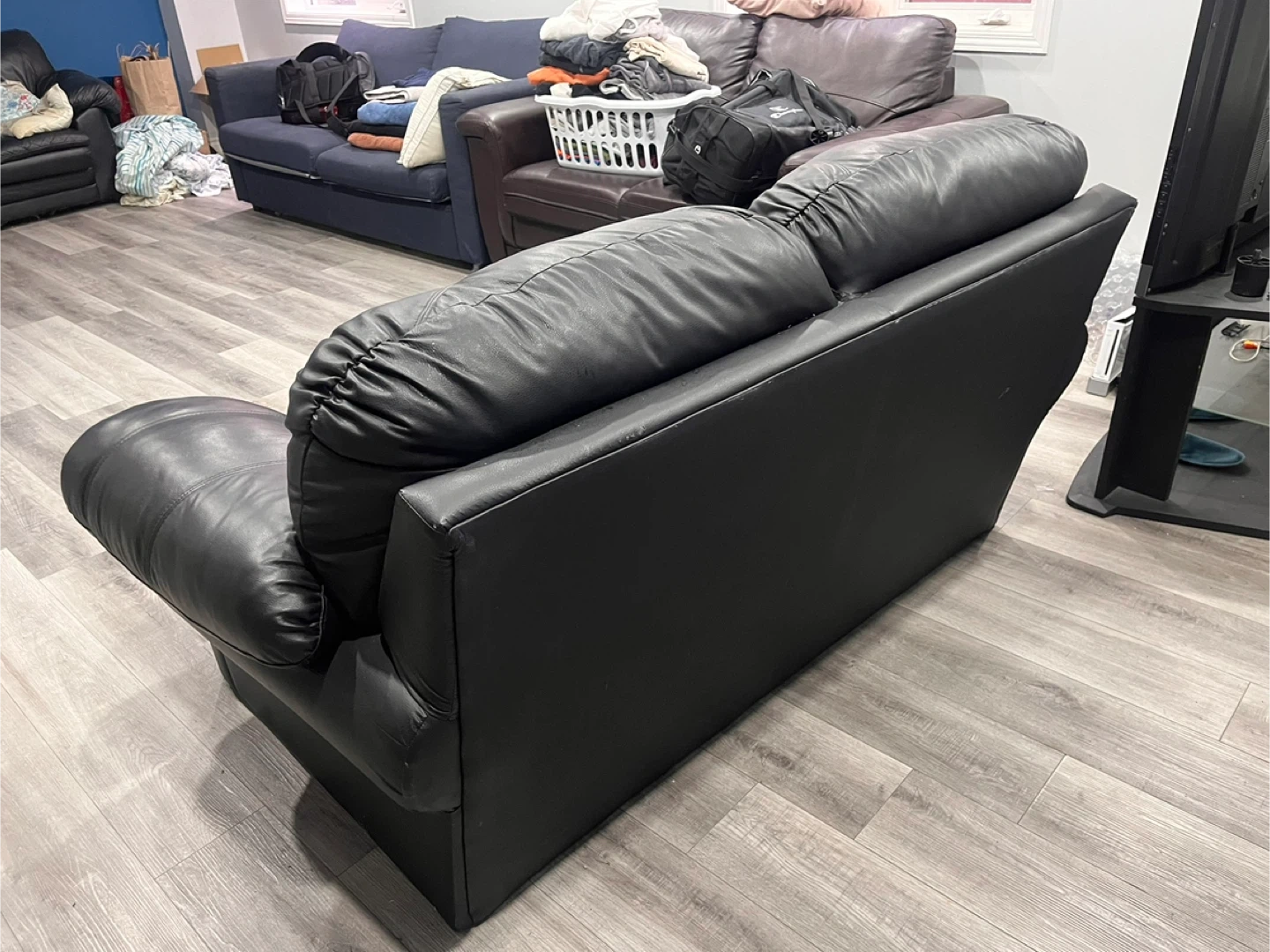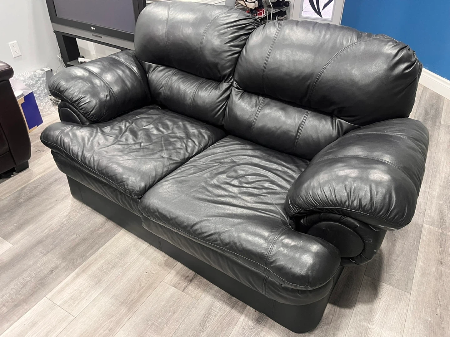 Comfortable black leather sofa. It has plush cushions and is perfect for a living room or den. This sofa offers ample seating for two people.