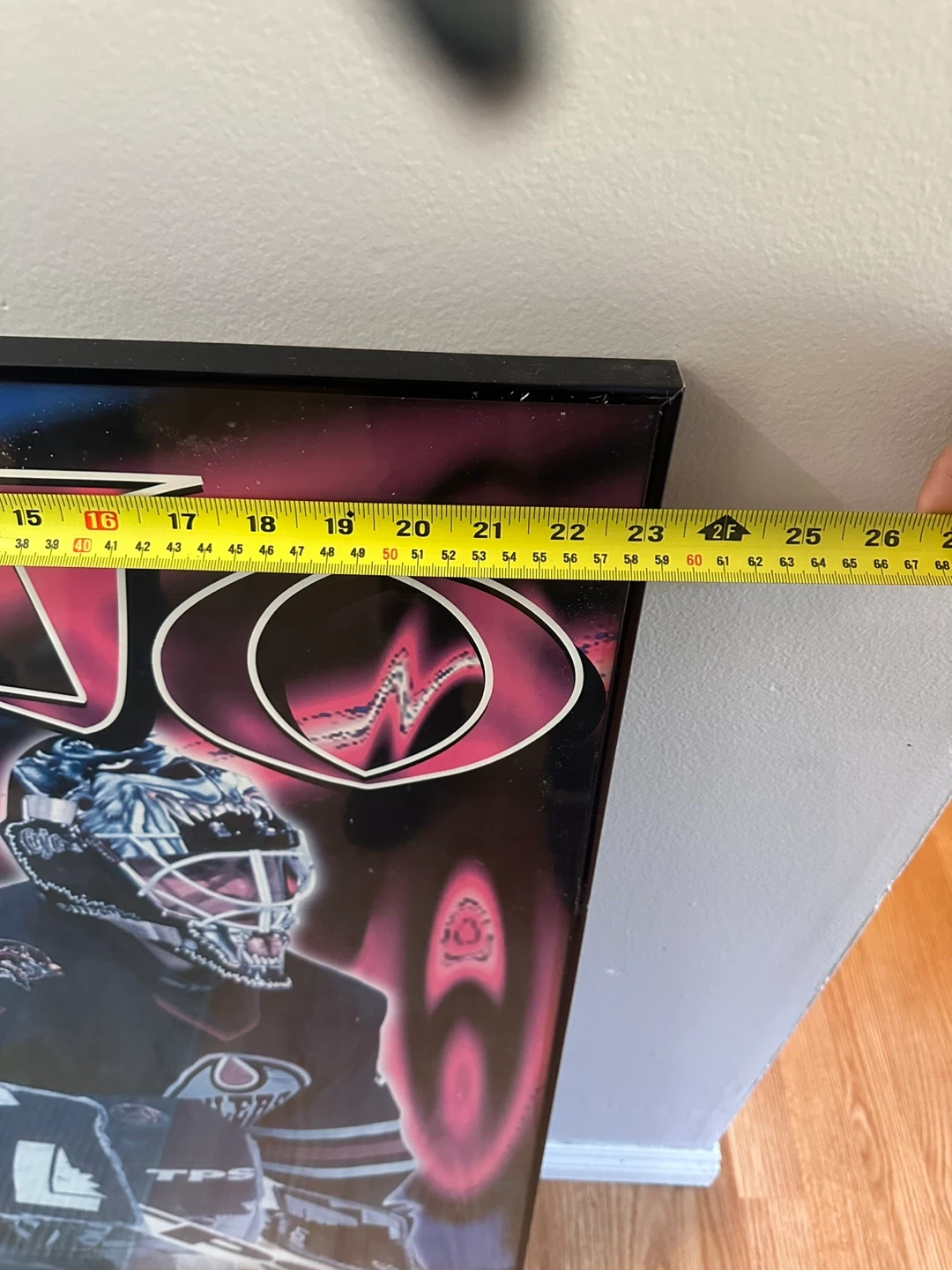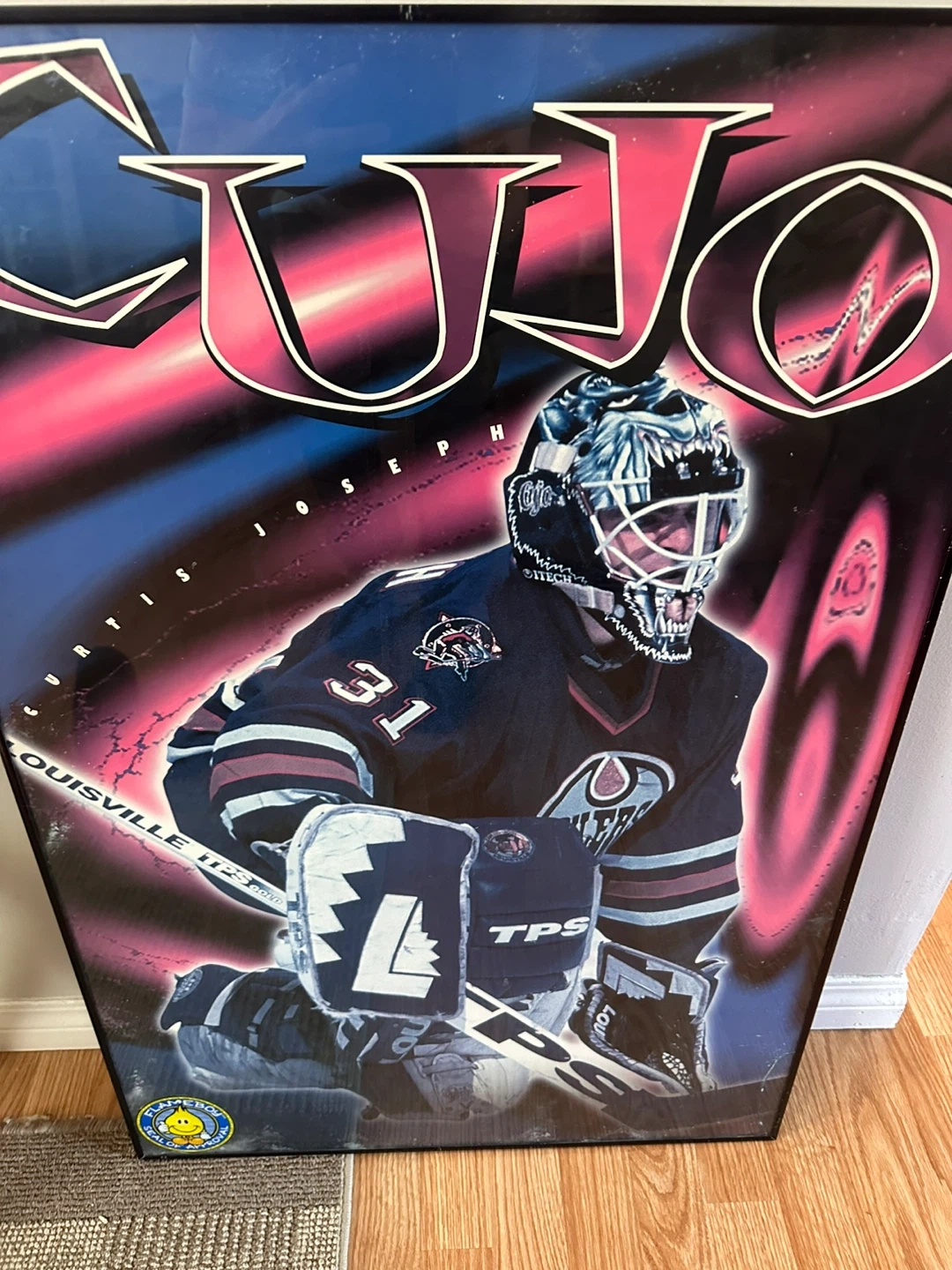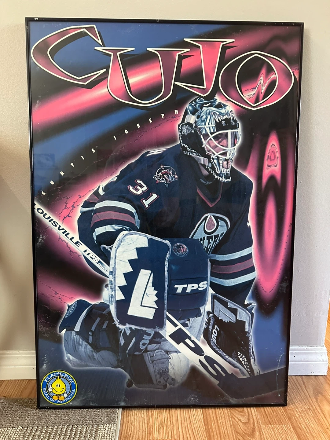 Framed poster of Curtis Joseph (CUJO) when he played for the Oilers. The poster is approximately 34 inches tall and 24 inches wide. It's in good condition and ready to hang in your home!