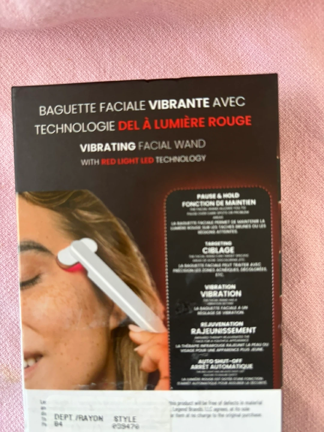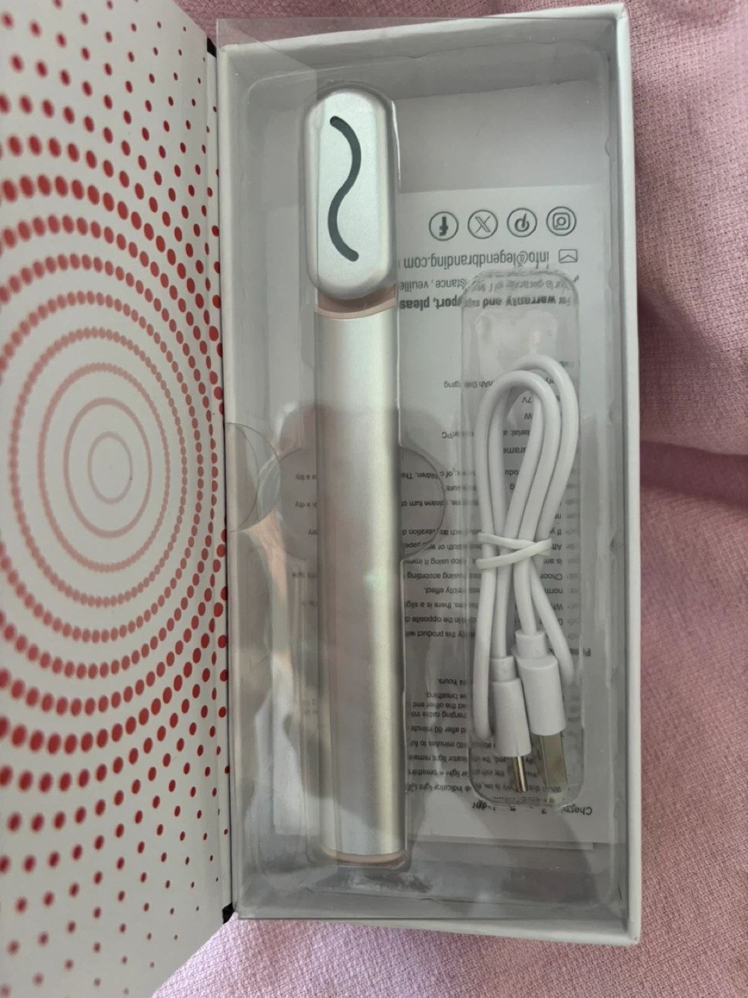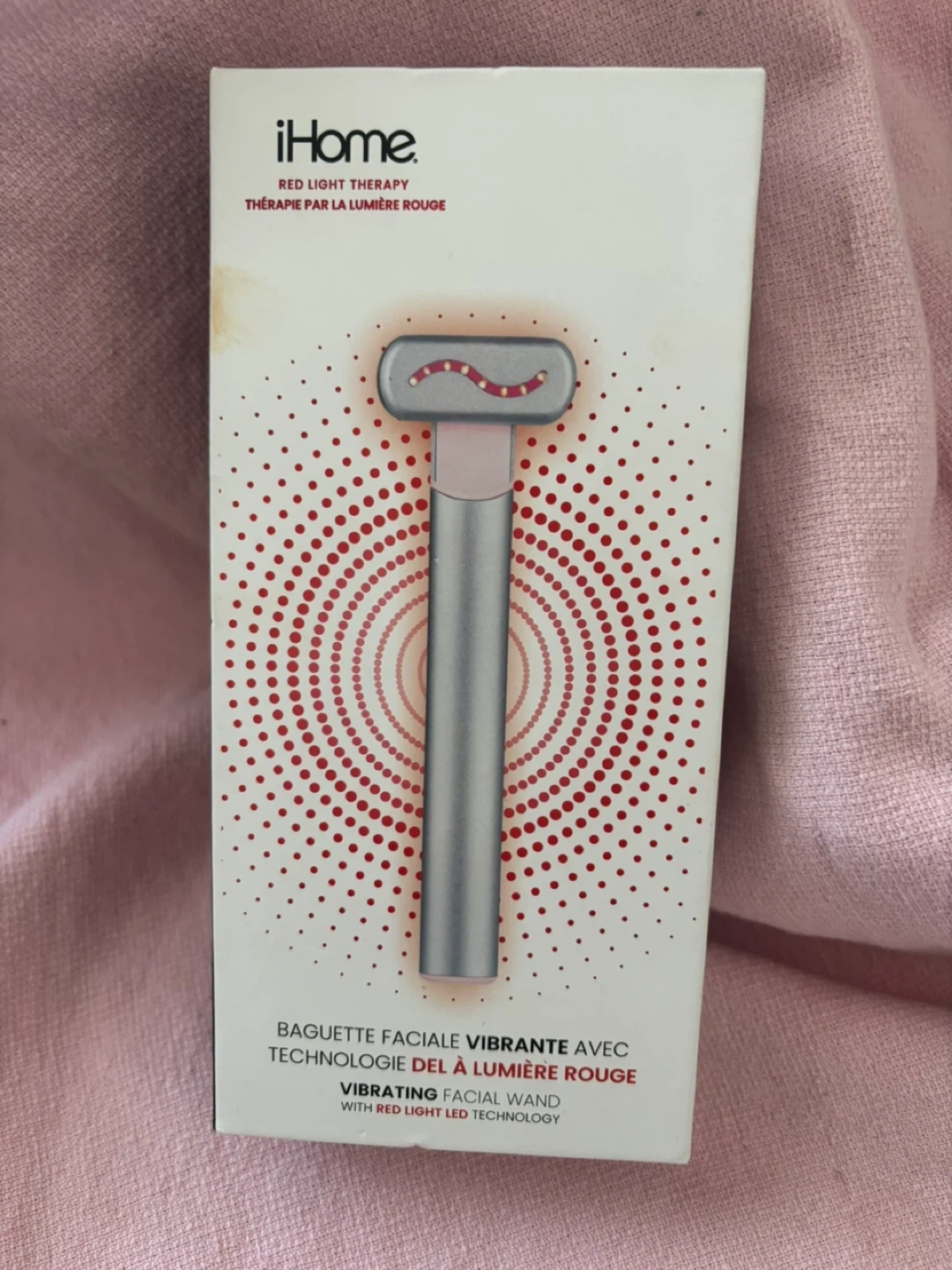 This iHome facial wand uses red light LED technology for therapy. It's a vibrating facial wand designed for skin rejuvenation. Includes the USB charging cable.