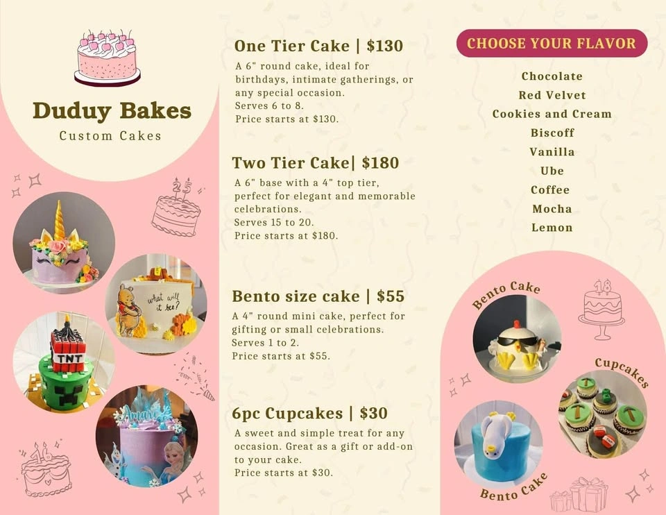 Craving something sweet and special? I offer custom cakes and cupcakes through Duduy Bakes! Whether it’s for birthdays, intimate gatherings, or special celebrations — we’ve got something for every occasion: One-Tier Cakes – from $130 (serves 6–8) Two-Tier Cakes – from $180 (serves 15–20) Bento Cakes – from $55 (perfect for gifting or small celebrations) 6pc Cupcakes – from $30 Flavors to choose from: Chocolate • Red Velvet • Cookies & Cream • Biscoff • Vanilla • Ube • Coffee • Mocha • Lemon Made with love and designed to make your celebration extra sweet! Feel free to message if you have any questions!