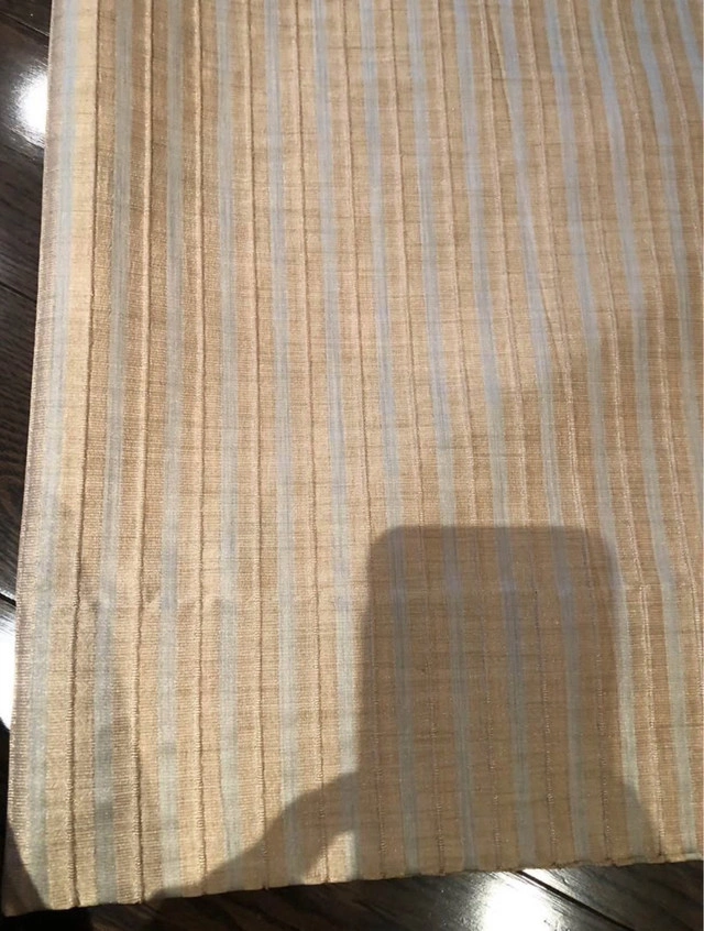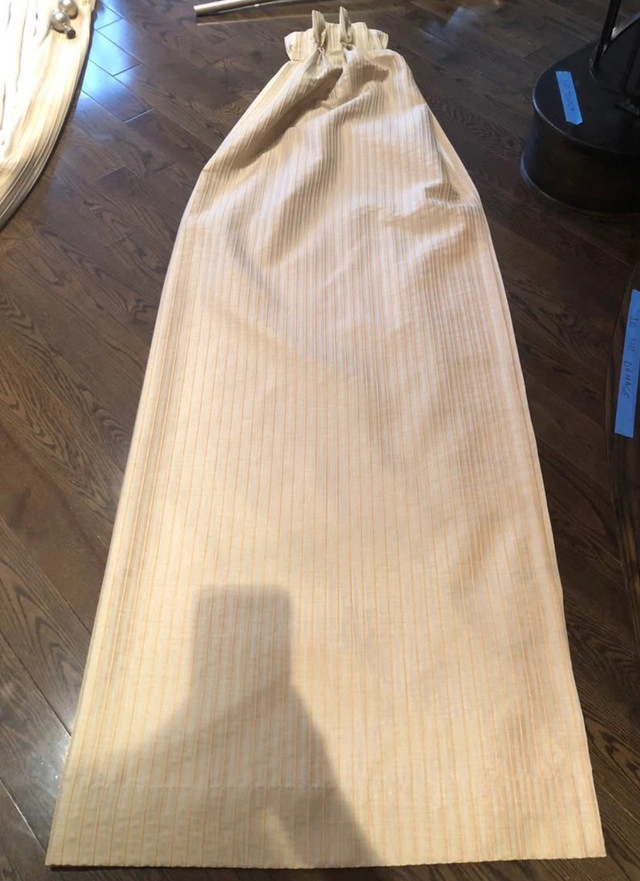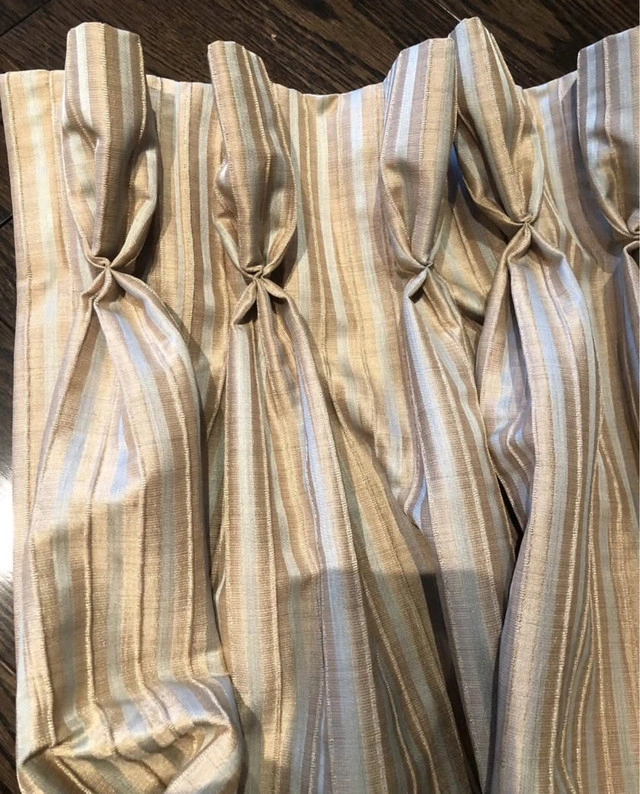 15These are used custom curtains with a stylish striped pattern and a pinch pleat design, perfect for adding elegance to any room. They are in good condition and ready to hang. * Pinch pleat design * Elegant striped pattern * Includes curtain rod Spruce up your living space with these chic curtains! Of course, if the ad is still up, the curtains are still available – ready to find a new home. W = 20" Length = 88" *4.5" allowance in hem