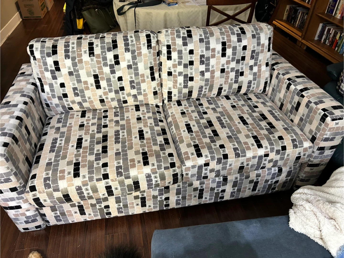 Virtually new sofa bed that is comfortable and stylish. This is not like the lumpy thing in your parent’s basement! It could be used as your main bed. Made by Decor Rest Furniture. Comes with sheets. It won’t fit into my guestroom so I have to sell it at a discount (I paid $3000 to have it made)