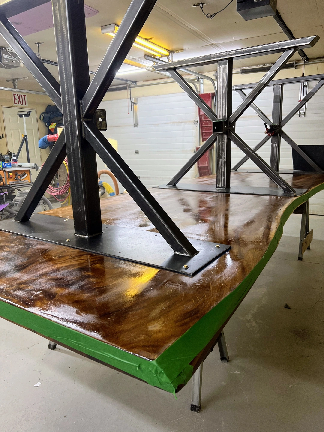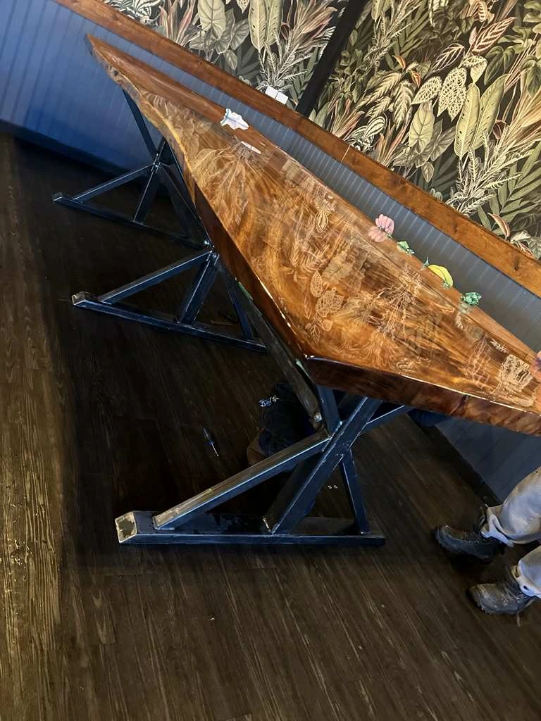 Beautiful custom-made live edge wood table with a sturdy steel base. This unique piece would be a great addition to any home or office. The wood grain is stunning and the steel base provides a modern touch.