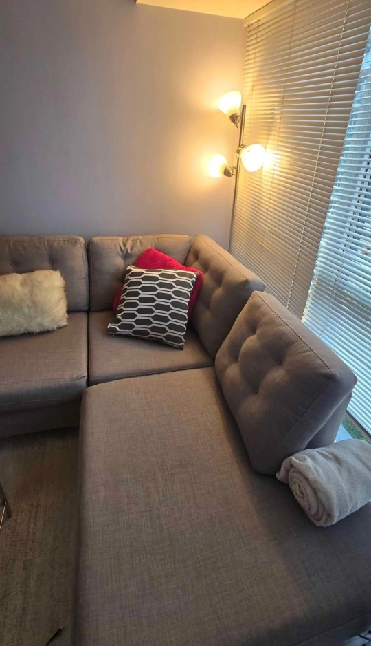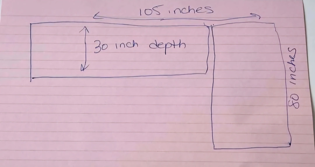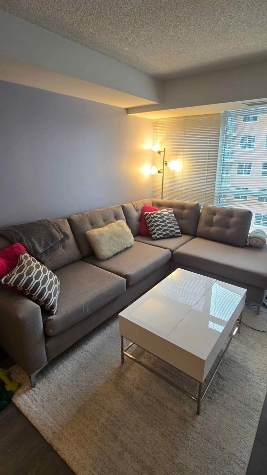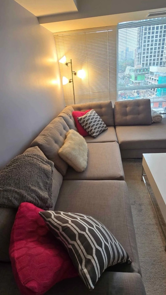 Beautiful custom made section sofa/couch. Measurements are 105' x 80 and 30' depth. Please see photo with measurements. Made to be extra deep, very comfortable for sleeping. Very good condition apart from two imperfections. Will be freshly steamed before pick up. One imperfection on a cushion but can be flipped over and hidden. Pick up only from Adelaide and Sherbourne M5A4S3.