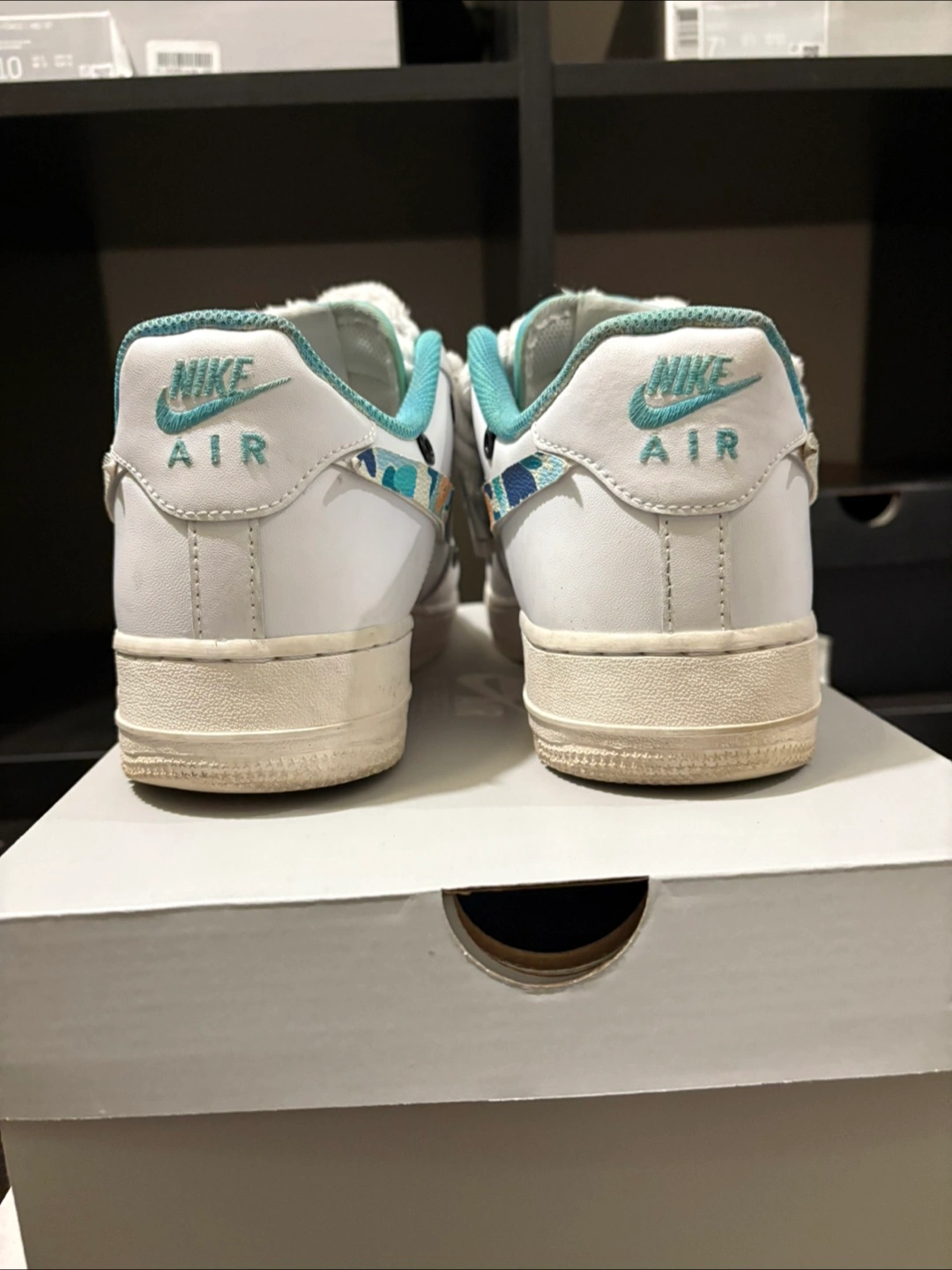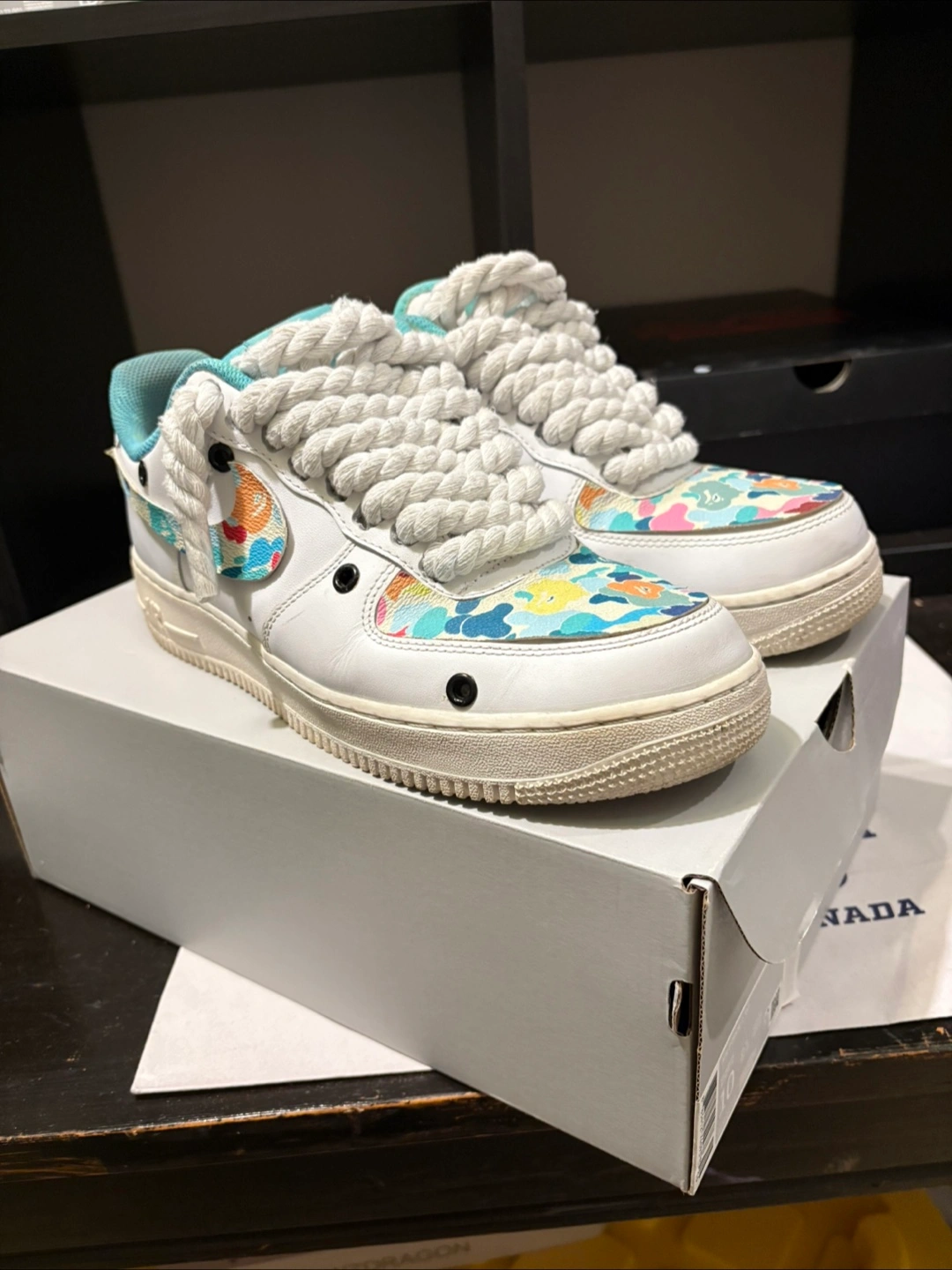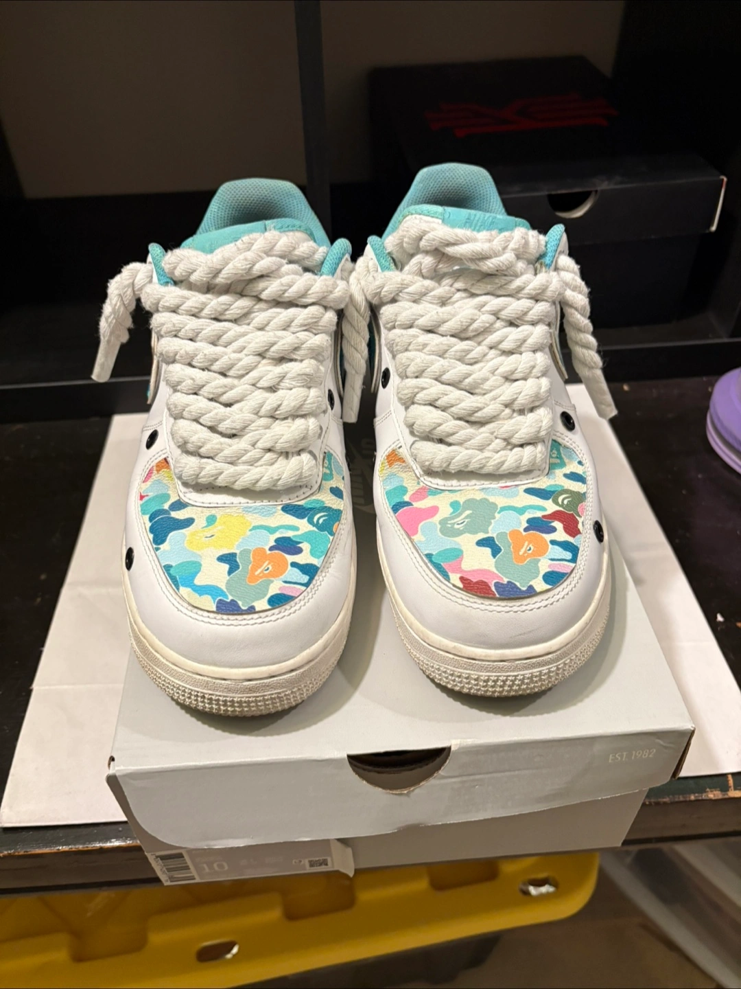 Selling a pair of used Nike Air Force 1 shoes with a custom Bape design. The shoes are a size 10 and come with the original box.