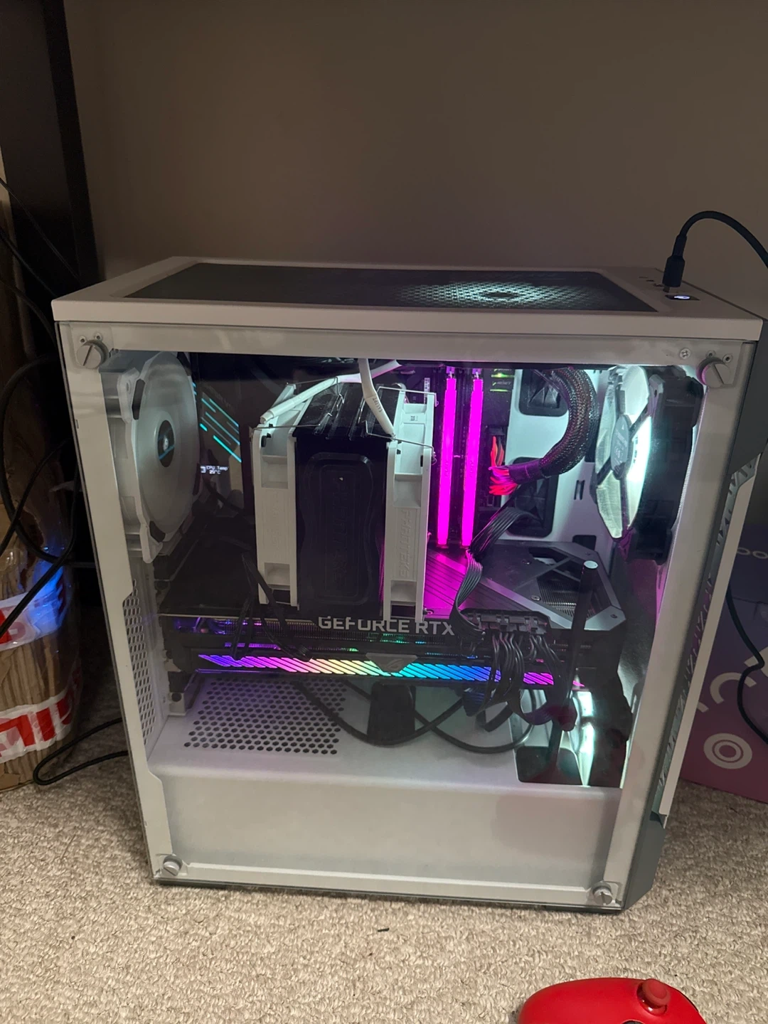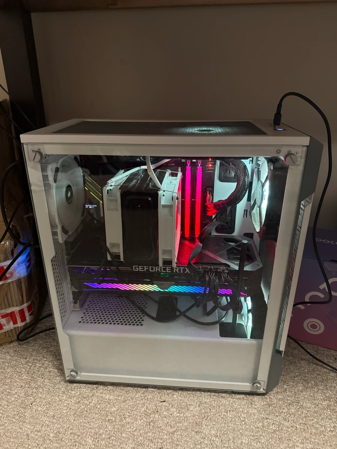 Selling a custom-built white PC gaming computer. It features a GeForce RTX 3080 graphics card and is in great condition. Perfect for gaming or other demanding tasks!