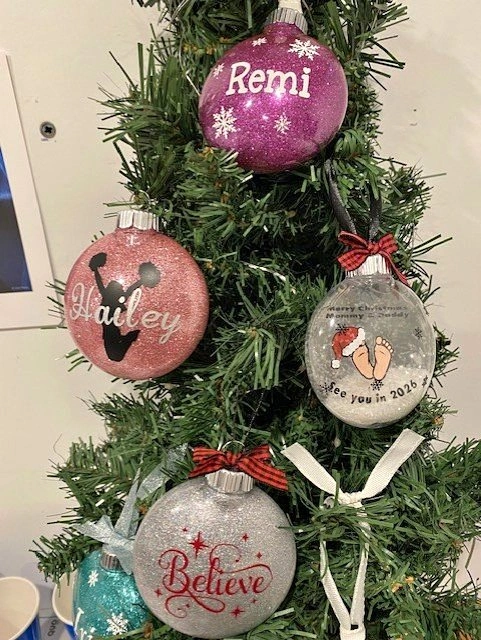 10Customized floating and glitter ornaments. Multiple colours and designs available. Great gift or stocking stuffer idea. Ornaments are approx. 3" wide.