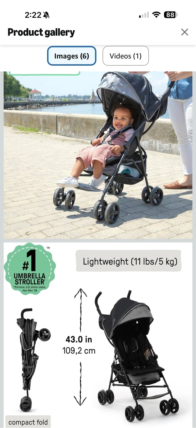 Compact folding stroller, lightweight and easy to carry. Good for travel, shopping trips, or everyday use.