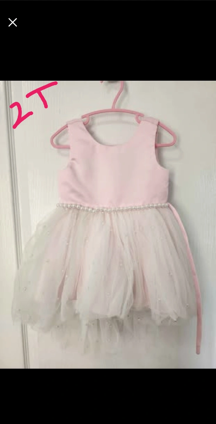 Selling a gently used dress in size 2T. It's a sweet pink and white dress with a tulle skirt and pearl detailing at the waist. Perfect for a special occasion or just to feel fancy!