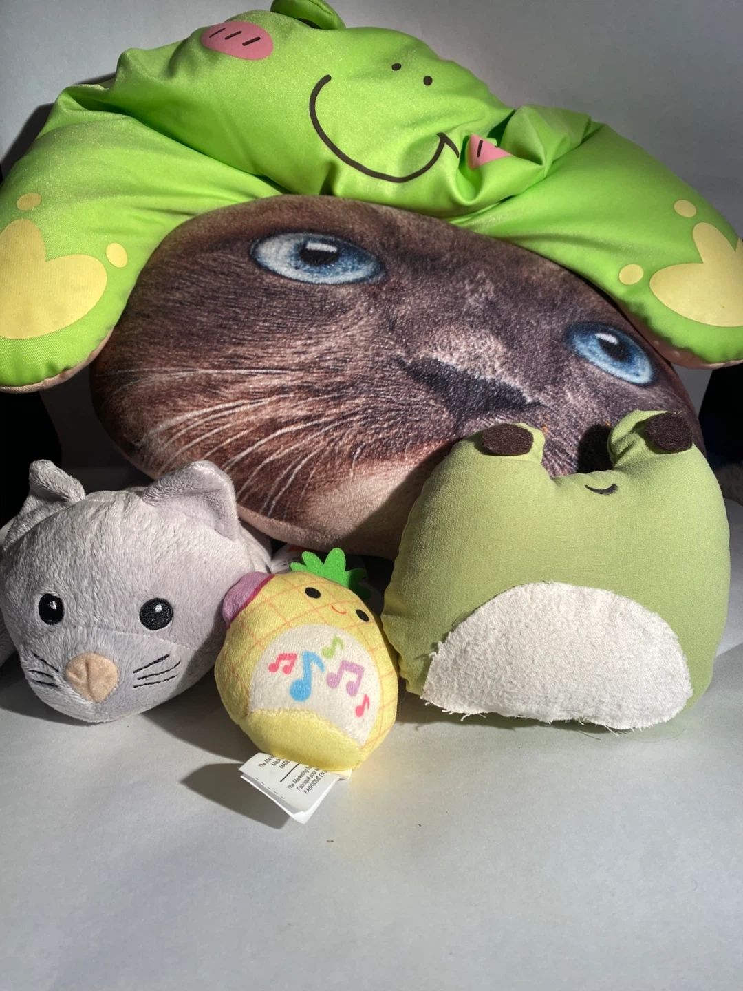 1391) cat pillow 2) small squishmallow 3) laying cat 4) frog neck pillow 5) hand made frog