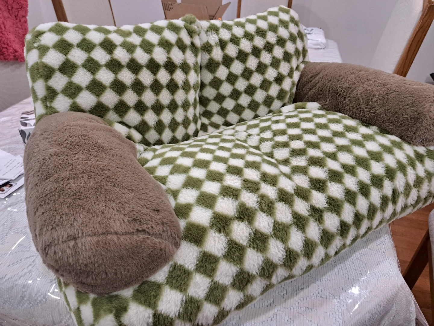 10Looking to give your furry friend a comfy place to relax? This adorable sofa bed is perfect for small dogs or cats. It features a soft, plush surface and a supportive back and armrests, making it the ideal spot for your pet to curl up and nap. The green and white checkered pattern adds a touch of style to any room! Size: 27"×20×13"