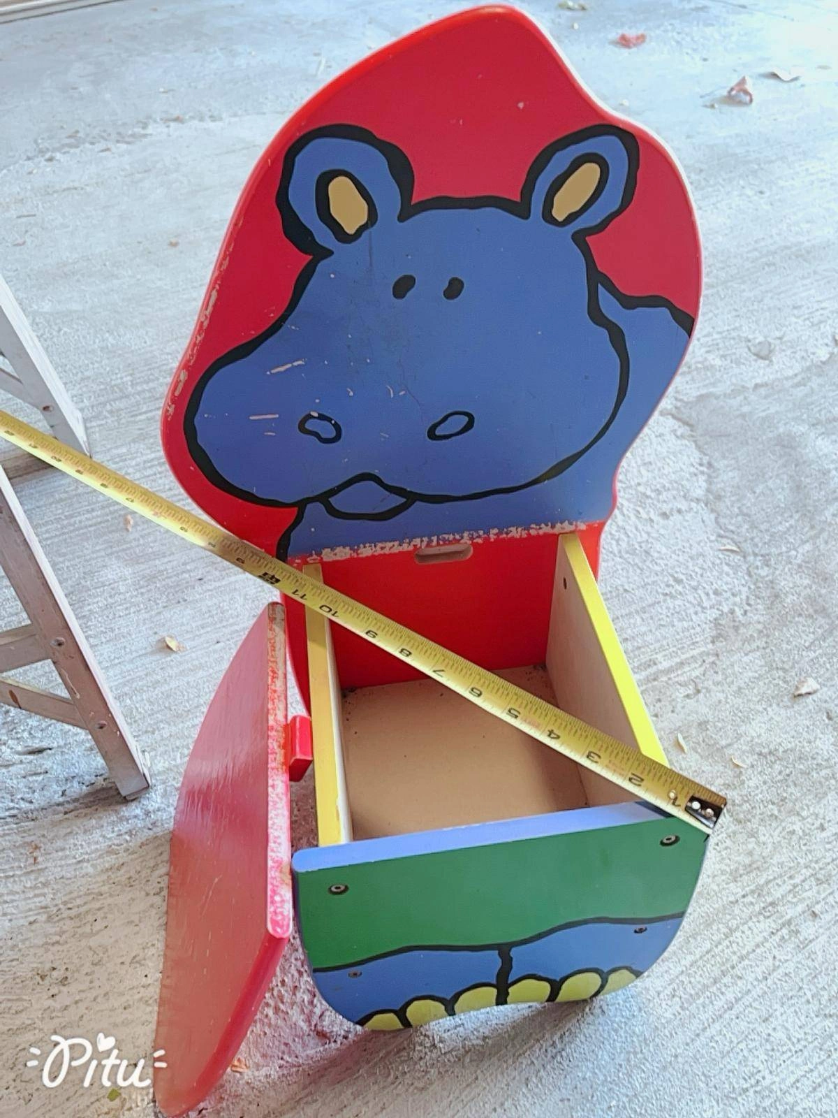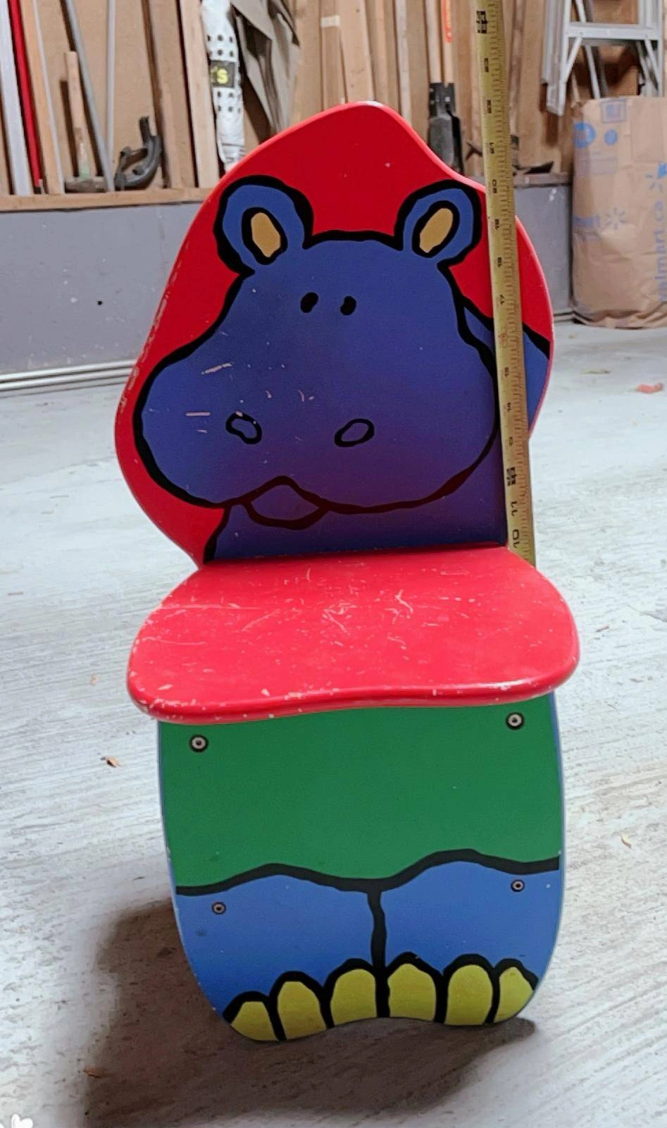 Colorful kids’ chair with a cute hippo design on the backrest, painted in bright red, blue, green, and yellow. It’s playful and sturdy, perfect for little ones.