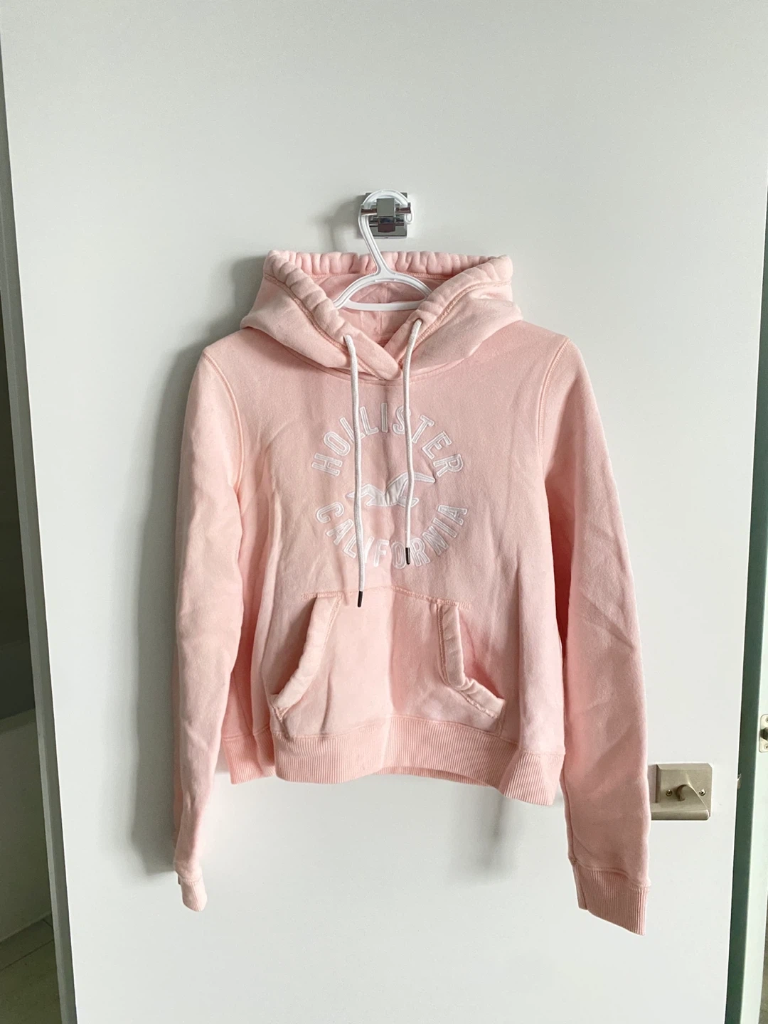 Selling a cute Hollister hoodie in a lovely baby pink colour! Worn once condition. Perfect for cozy days or layering up. The iconic Hollister logo is embroidered on the front. It's super comfy and stylish! Has a pocket pouch, deep hood, functional drawstrings. Size Medium ❤️ Check out my other listings for great deals!