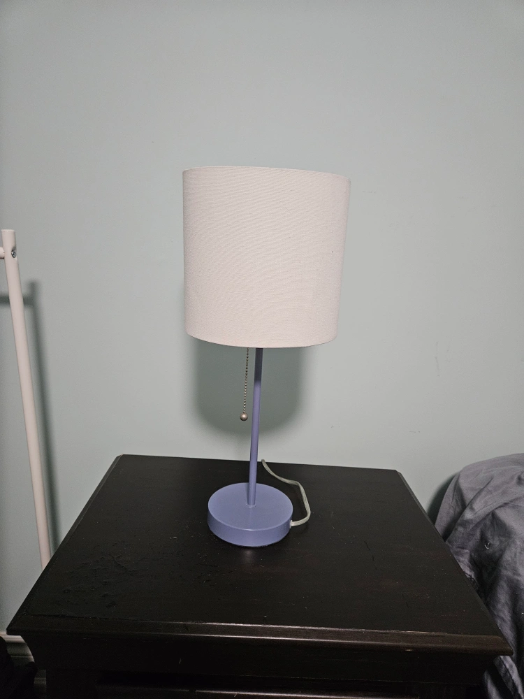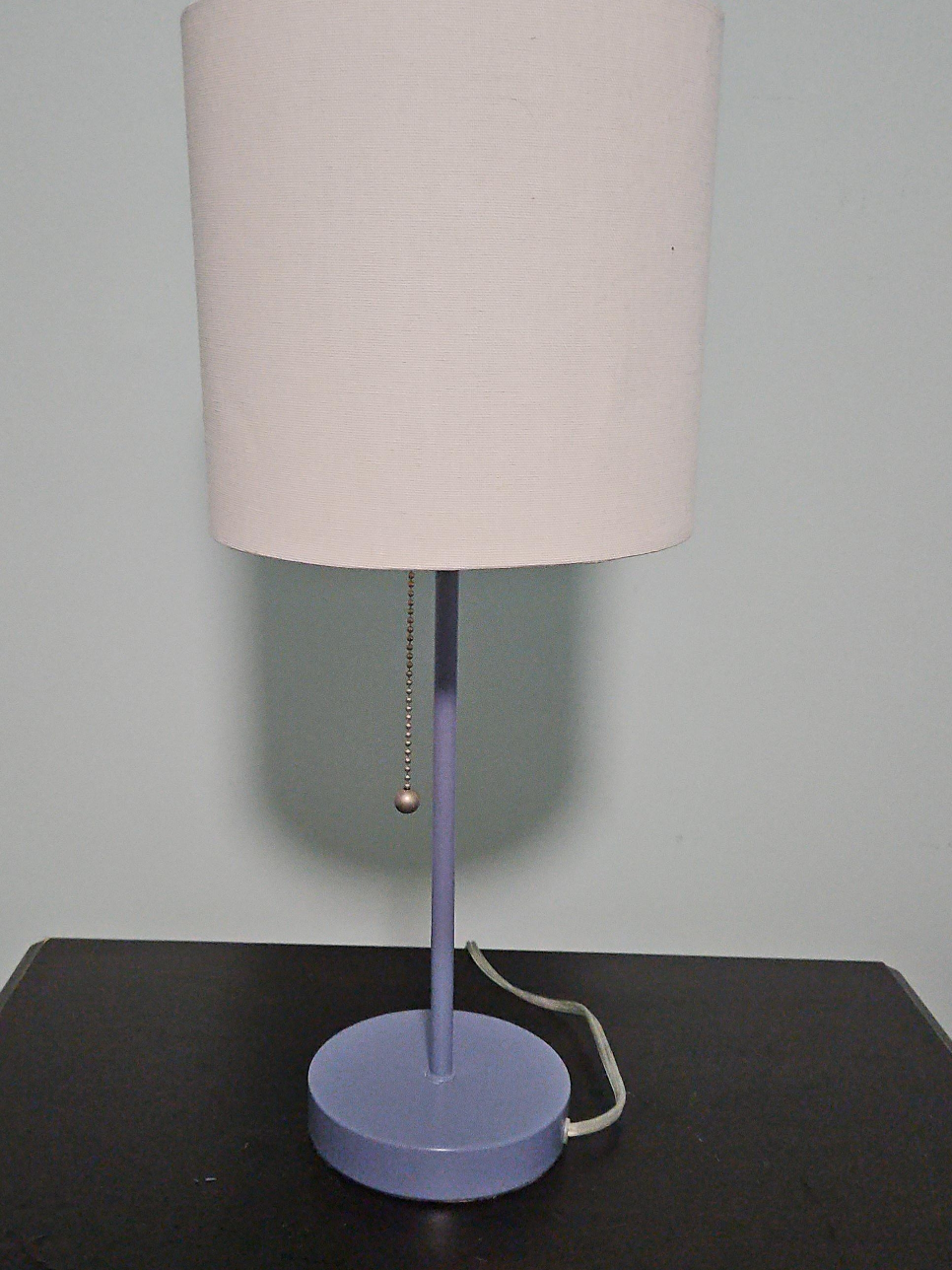 65Selling a cute table lamp in a lovely shade of purple! It's in great condition and would be perfect for a bedside table or desk. It has a pull-chain to switch it on and off.