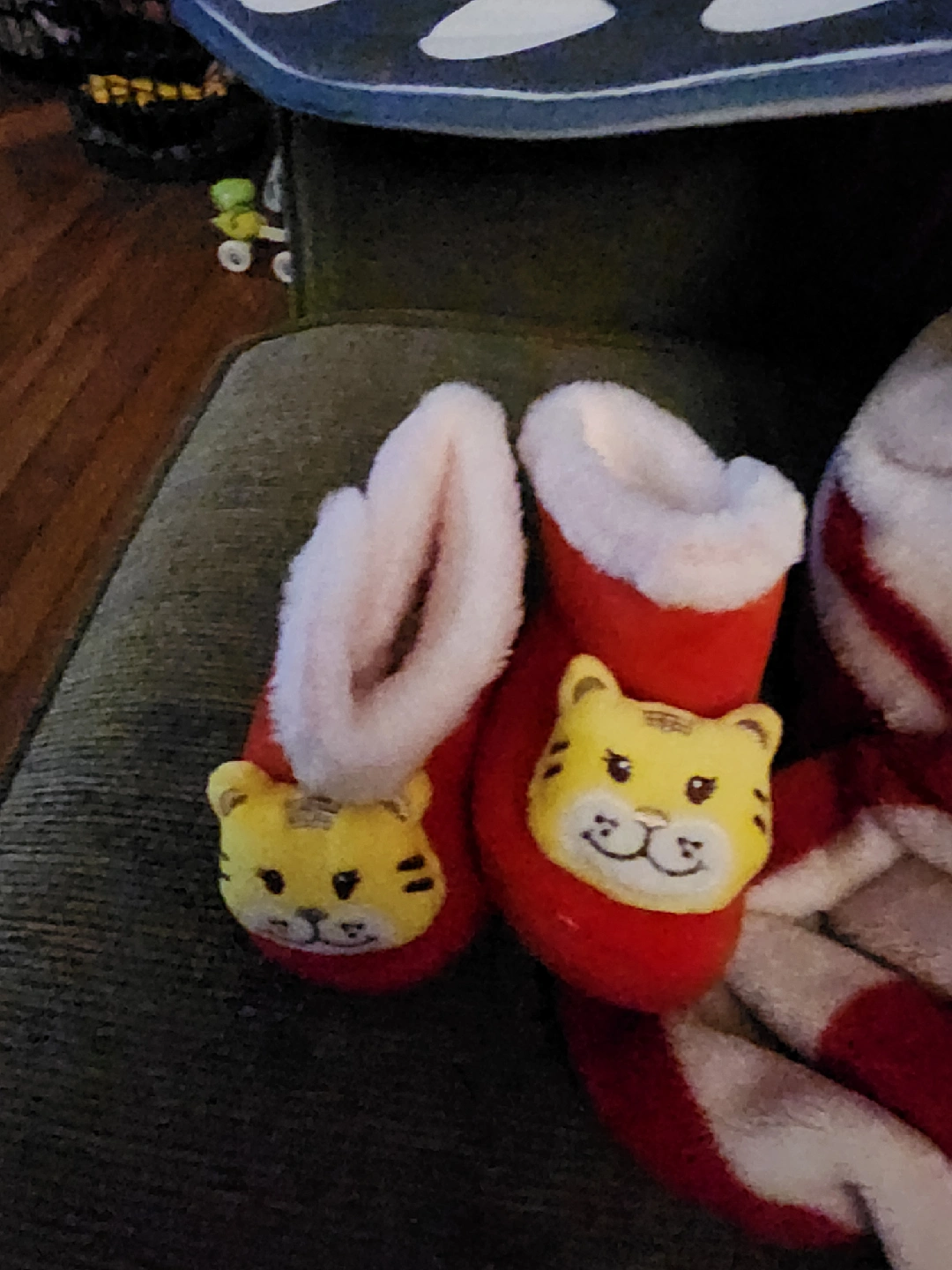 109Adorable red slippers with cute tiger faces! They're perfect for keeping little feet warm and cozy around the house