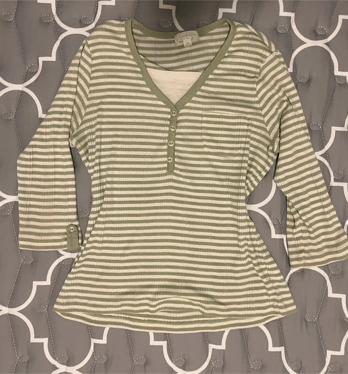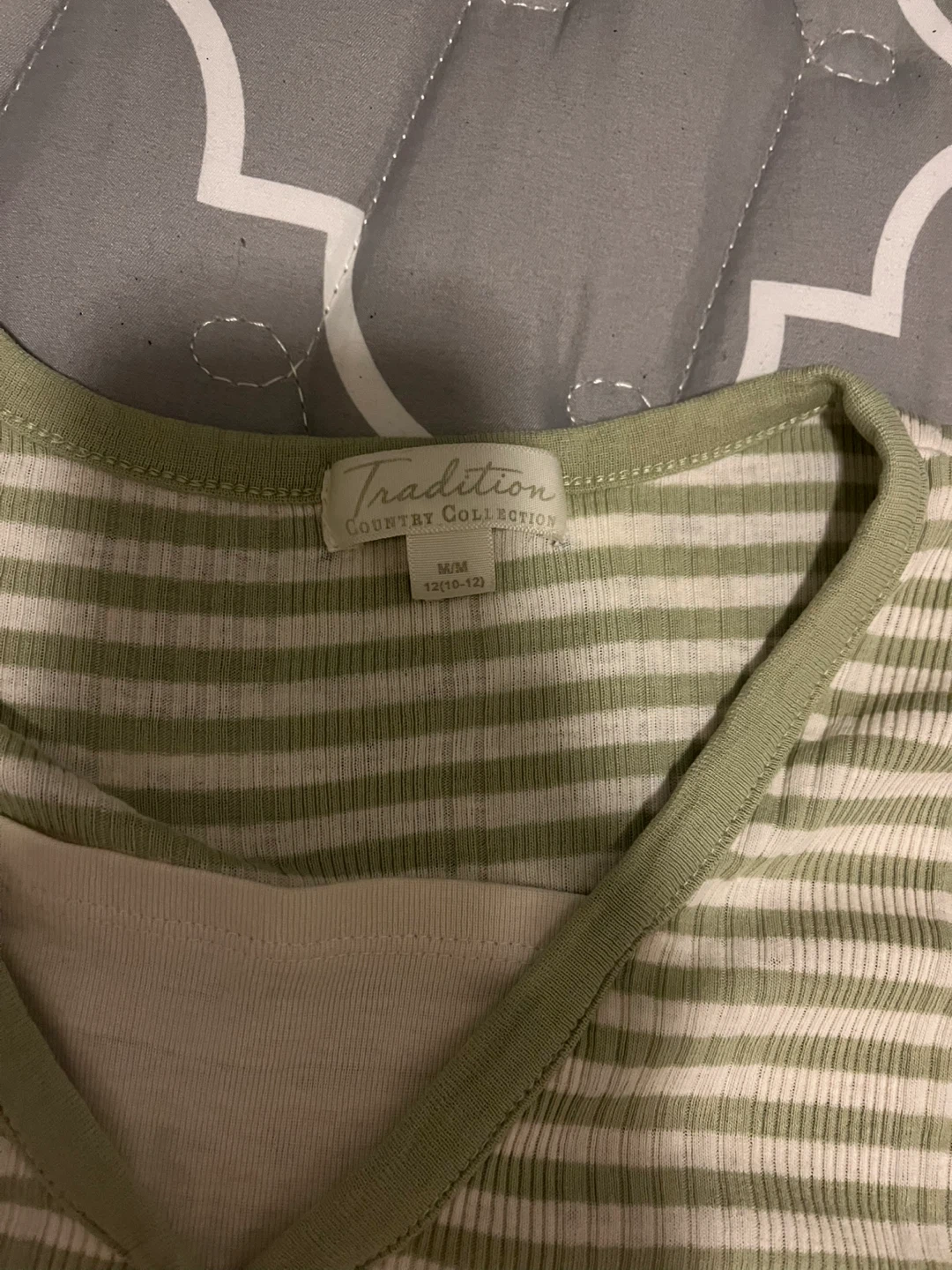 182Vintage Tradition Country Collection top in size M (12-14). It features a striped pattern in a soft green and white colour. Perfect for casual wear!