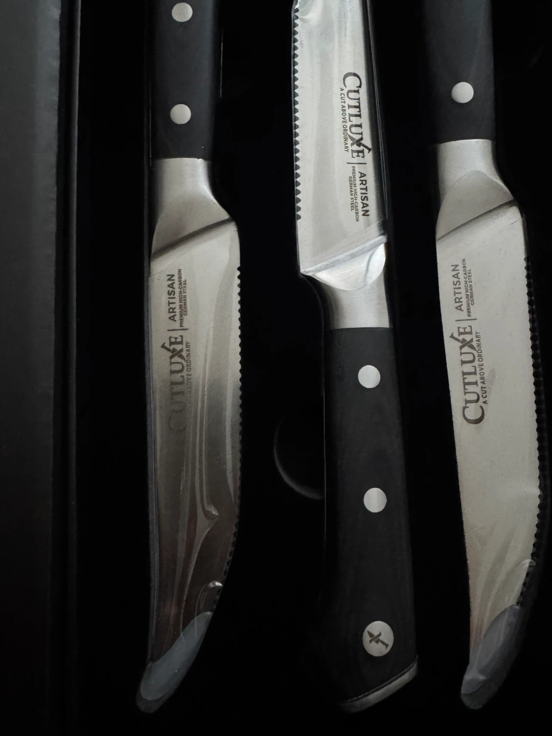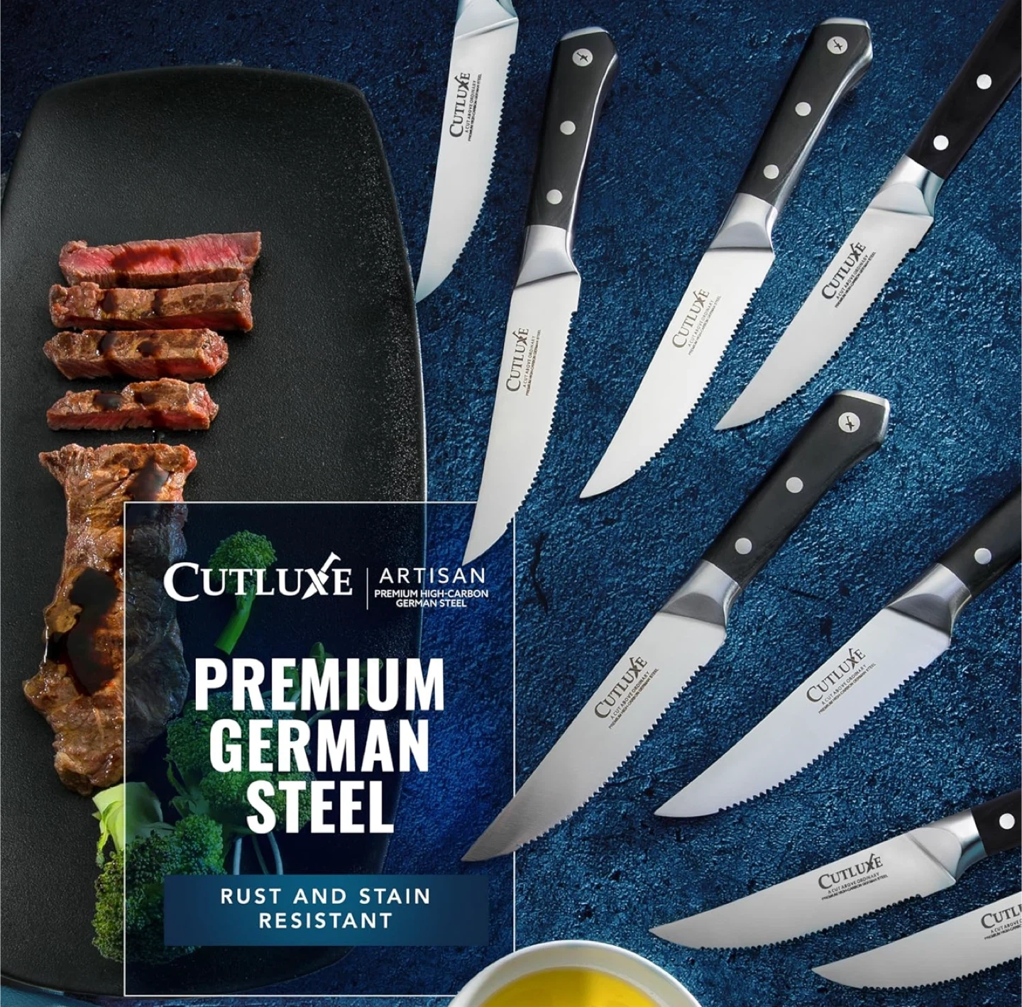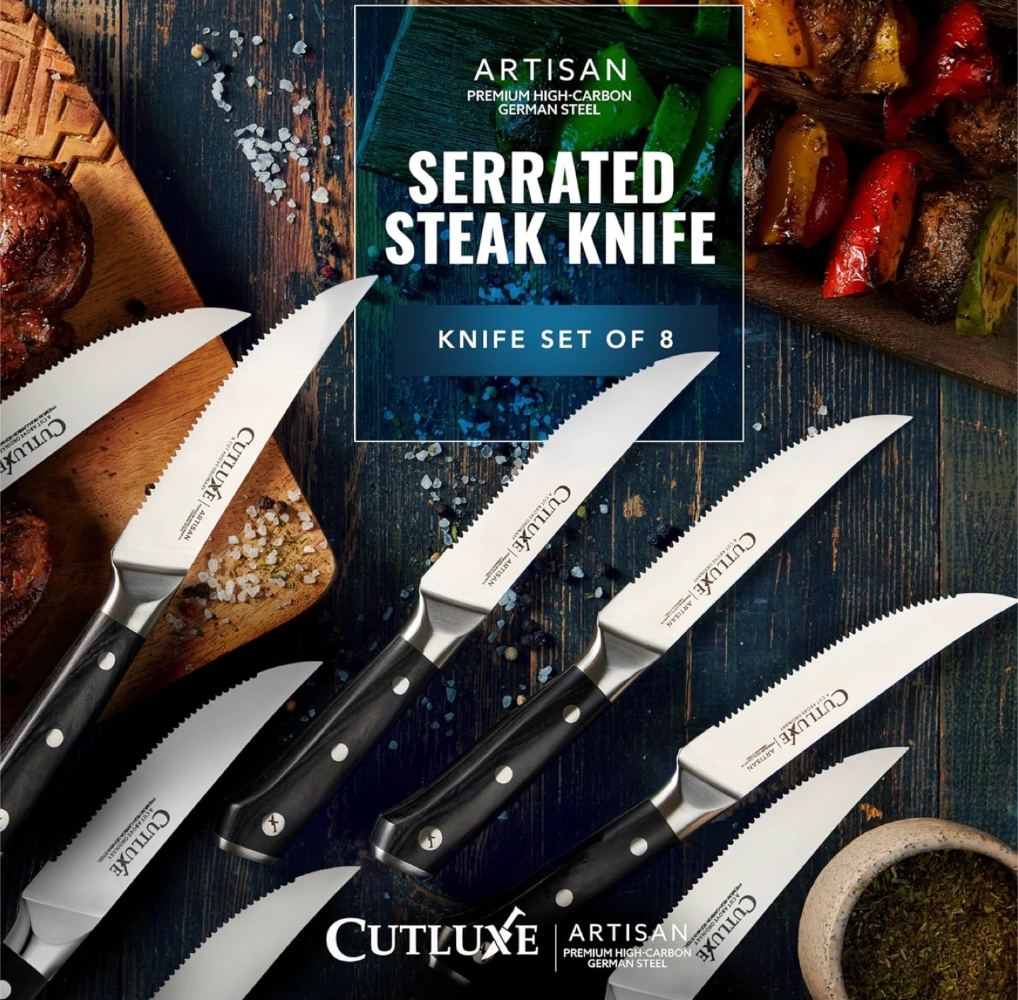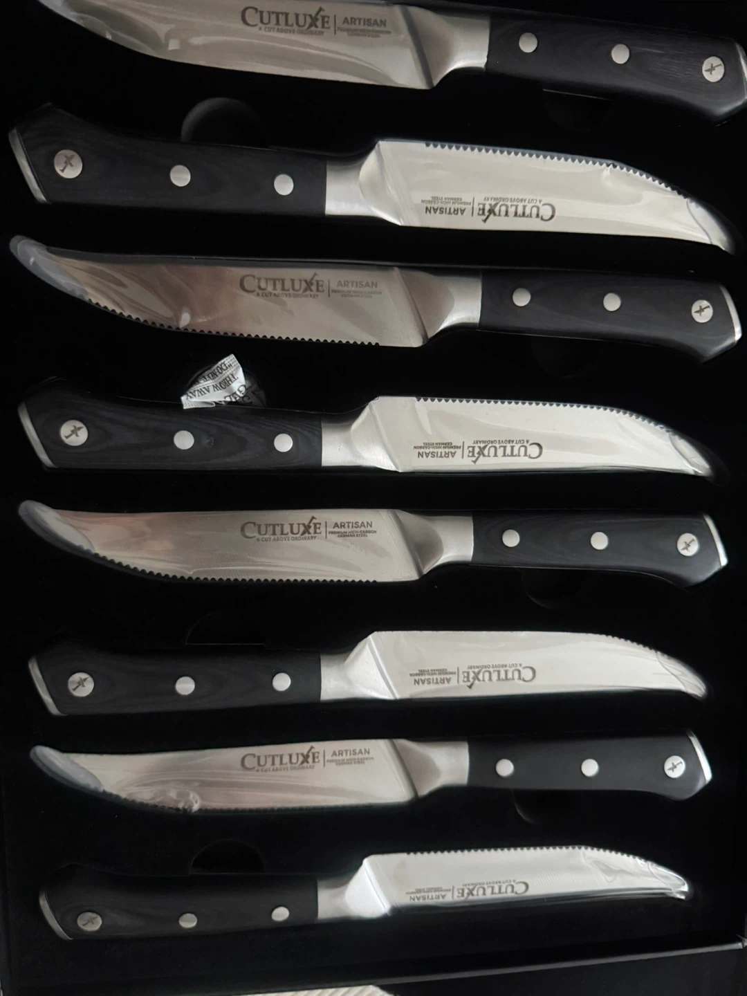 โก๏ธ NEW! Cutluxe Steak Knives Set of 8 โก๏ธ ๐ฅฉ Perfect cuts every time โ enjoy your steak with ease! ๐ช Serrated Blades โ crafted from forged high carbon German steel for long-lasting sharpness. ๐ Full Tang & Ergonomic Handle โ comfort and control in every slice. โจ Artisan Series โ elegant design for your dining table. ๐ฆ Brand New โ never used, sealed set of 8. ๐ฅ Upgrade your kitchen & dining experience today!