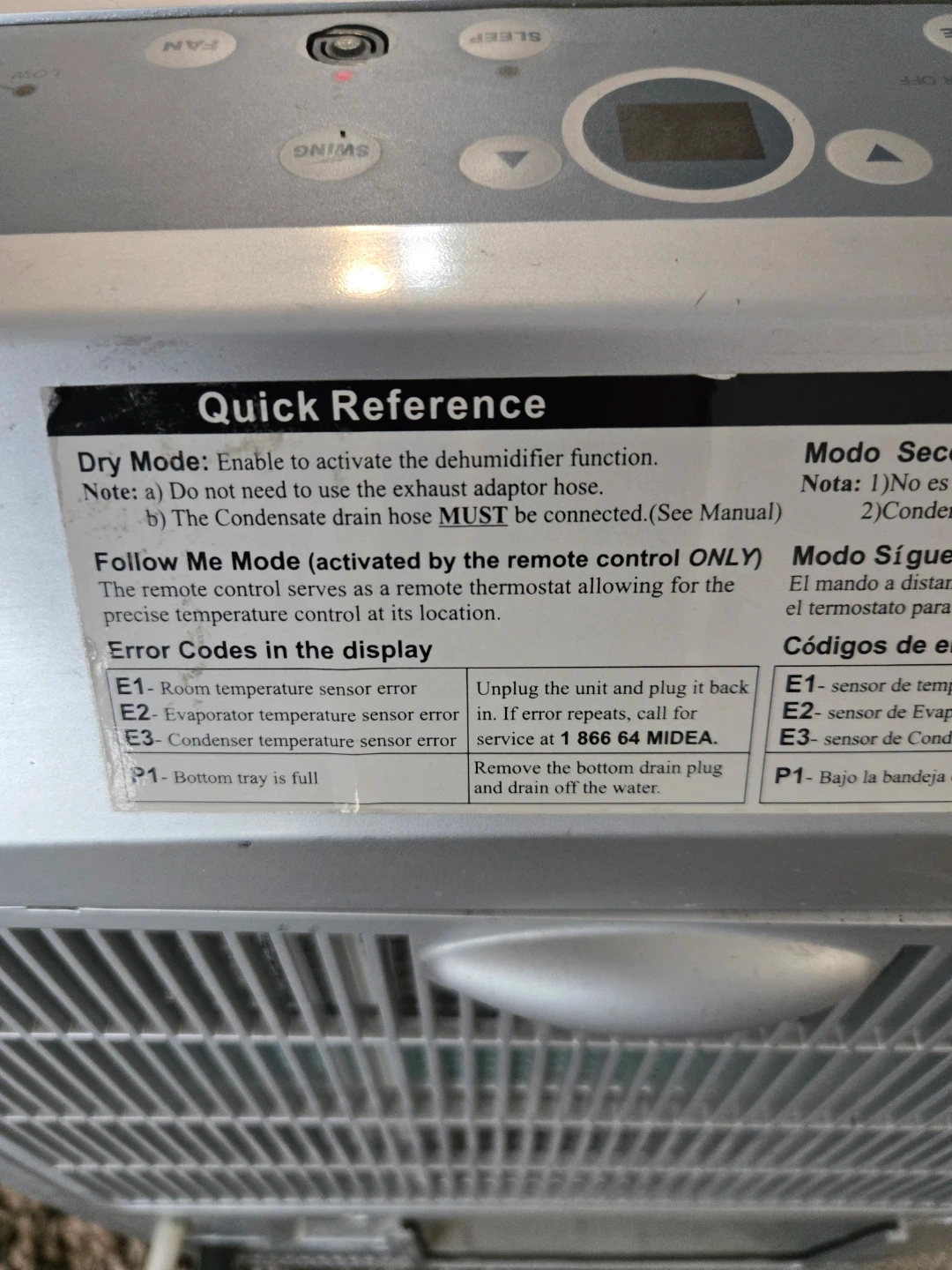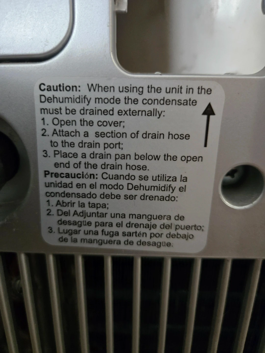 This is an Everstar portable air conditioner. It has a cooling capacity of 10000 BTU/h. The unit is silver and comes with its power cord, drainage hose, window insert and hose.