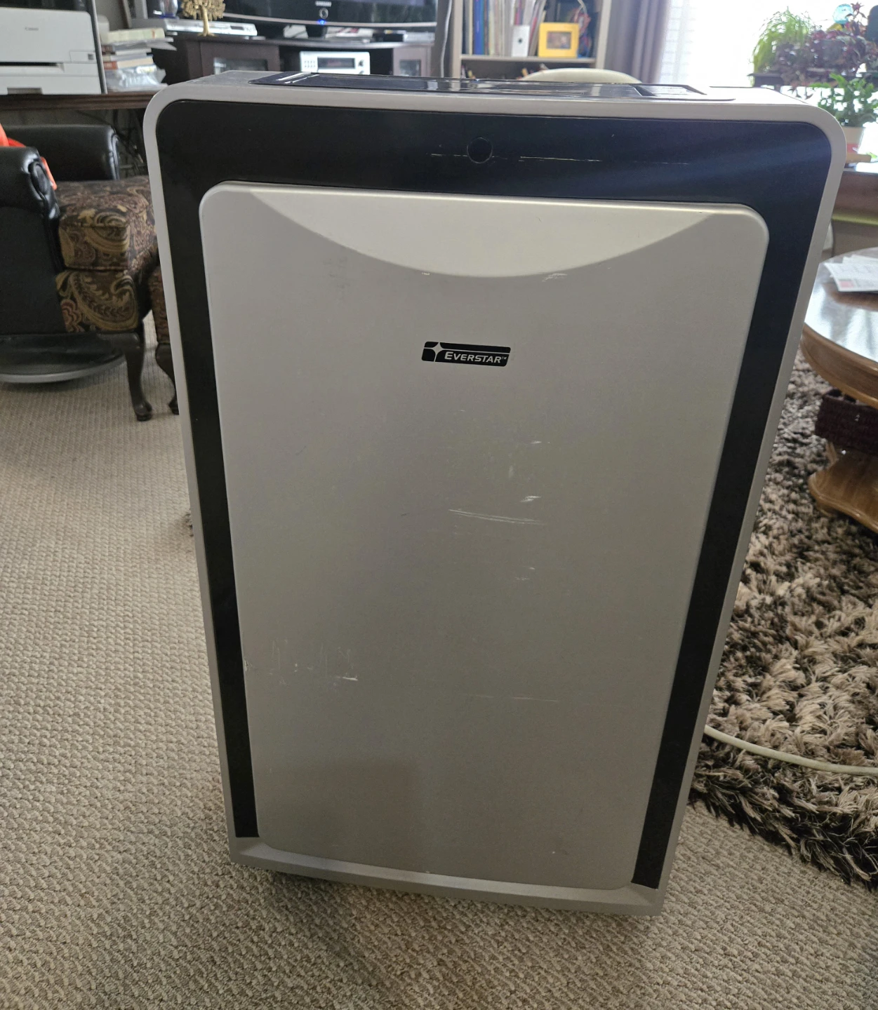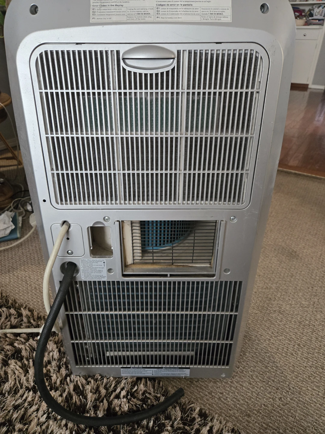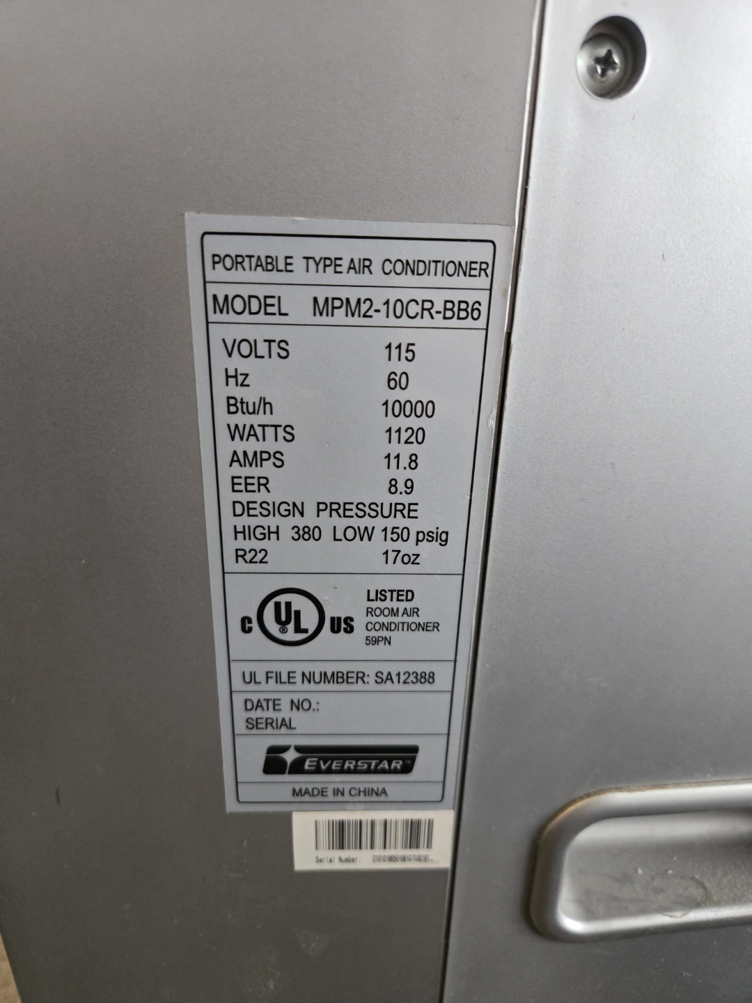 This is an Everstar portable air conditioner. It has a cooling capacity of 10000 BTU/h. The unit is silver and comes with its power cord, drainage hose, window insert and hose.