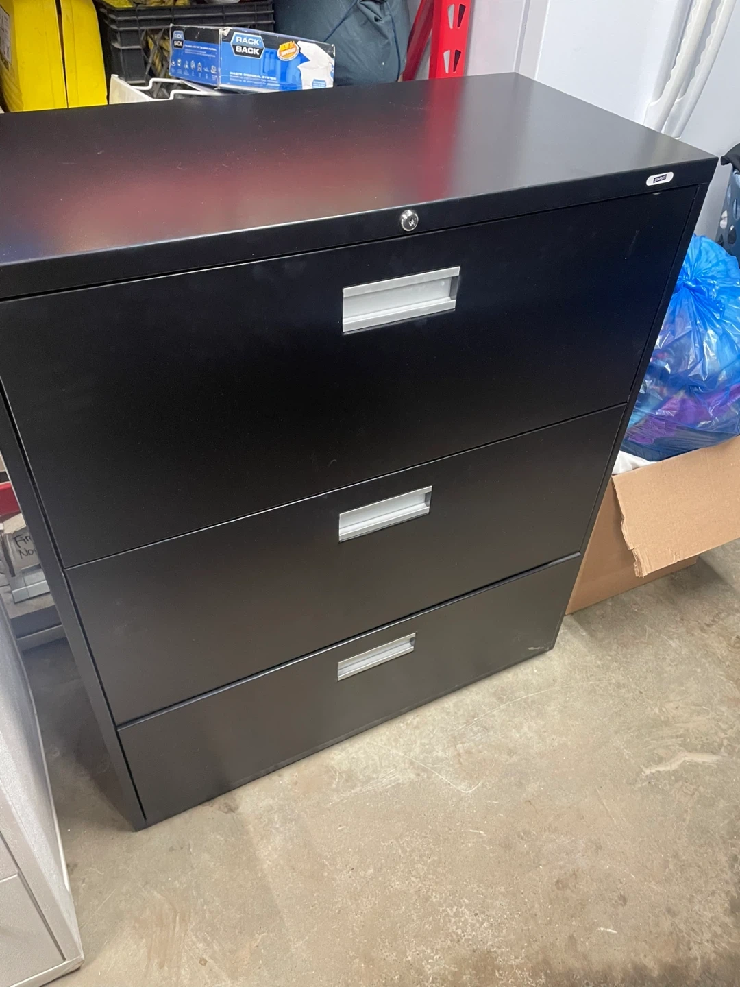 Black metal filing cabinet with three drawers. It's designed for letter-size files and includes a lock for security. This cabinet is great for keeping your office organized. comes from a pet free home at smoke free home $20.