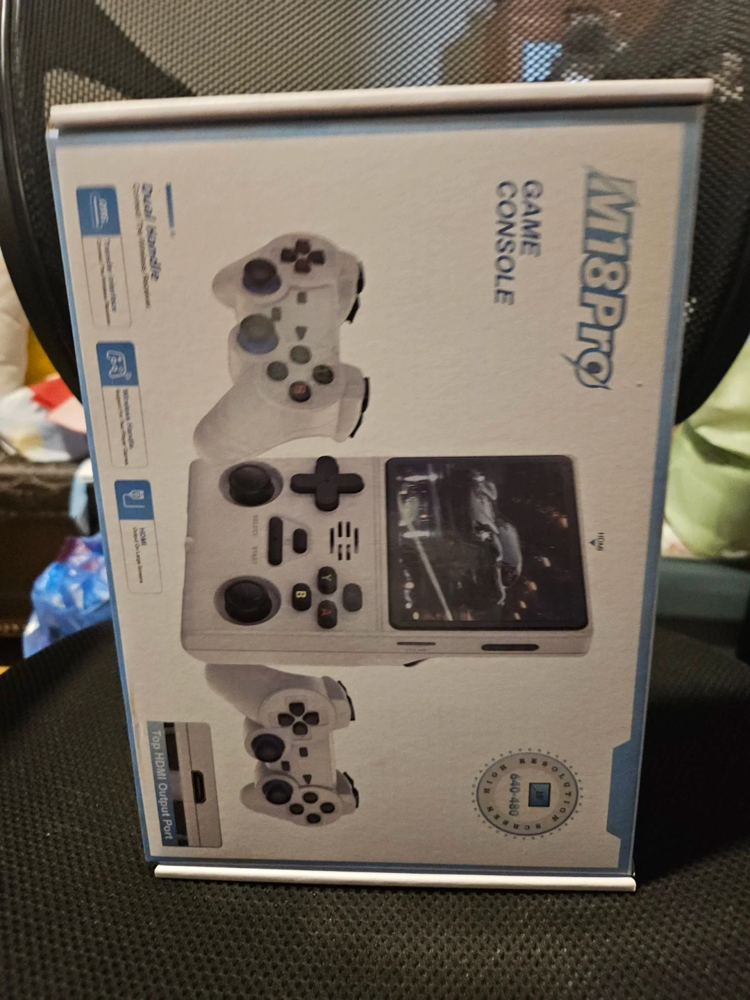 Selling a brand new M18Pro handheld game console! It comes in its original box and includes dual handles. It features a 3.5-inch IPS OCA Full Fit HD Screen with 640*480 pixels. The CPU is a Dual-Core CPU up to 1.2GHz, with 2GB of DDR3 RAM. It supports HDMI TV output and has a 16G-256G TF Card. The 3500mAh battery can play games continuously for 7 hours. It also has a Type-C charging / Type-C-OTG data port