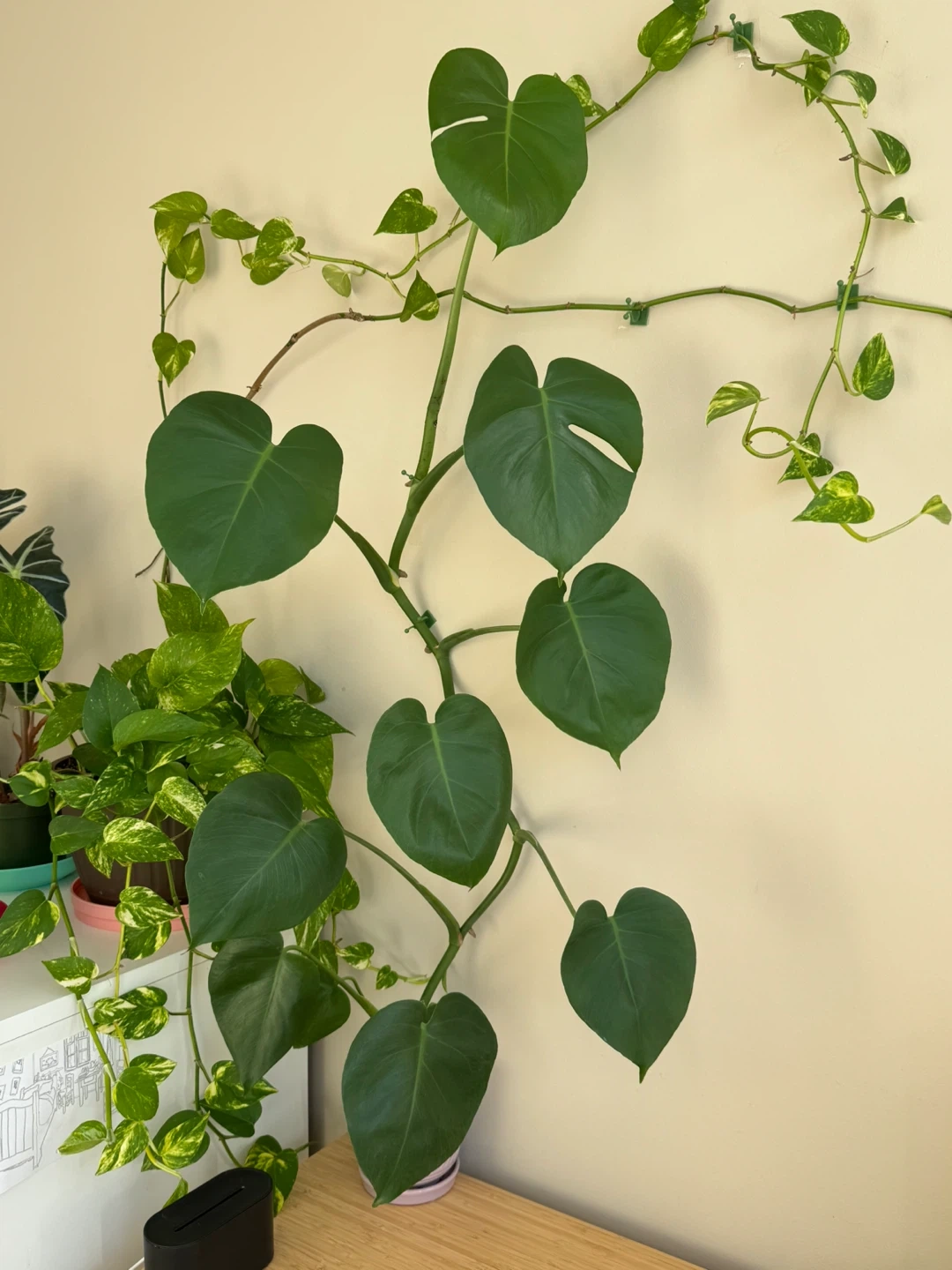 Healthy Monstera Adansonii plant with trailing vines. It's currently supported on a wall and growing well. A classic houseplant for adding some green to your space!