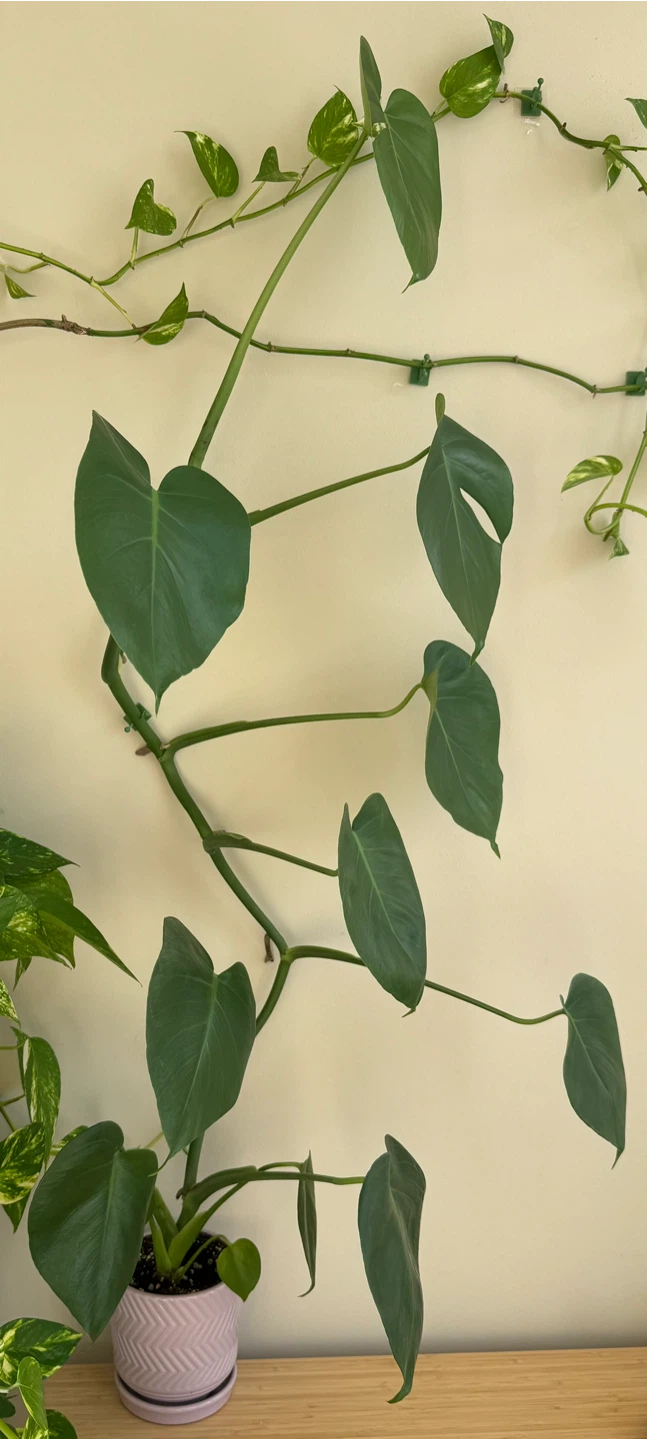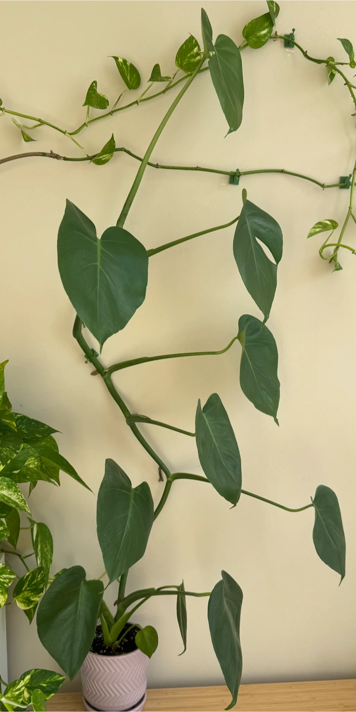 Healthy Monstera Adansonii plant with trailing vines. It's currently supported on a wall and growing well. A classic houseplant for adding some green to your space!