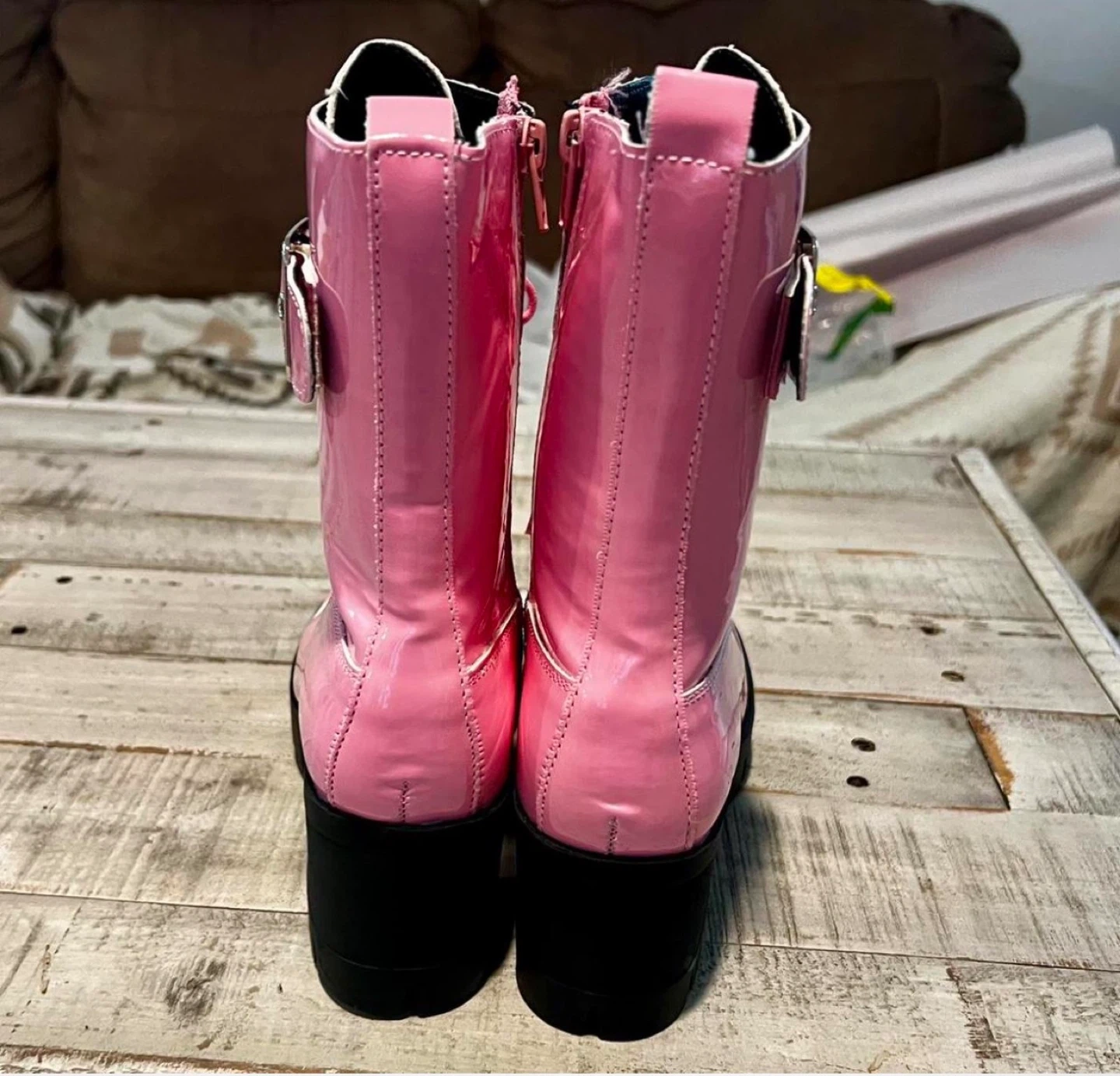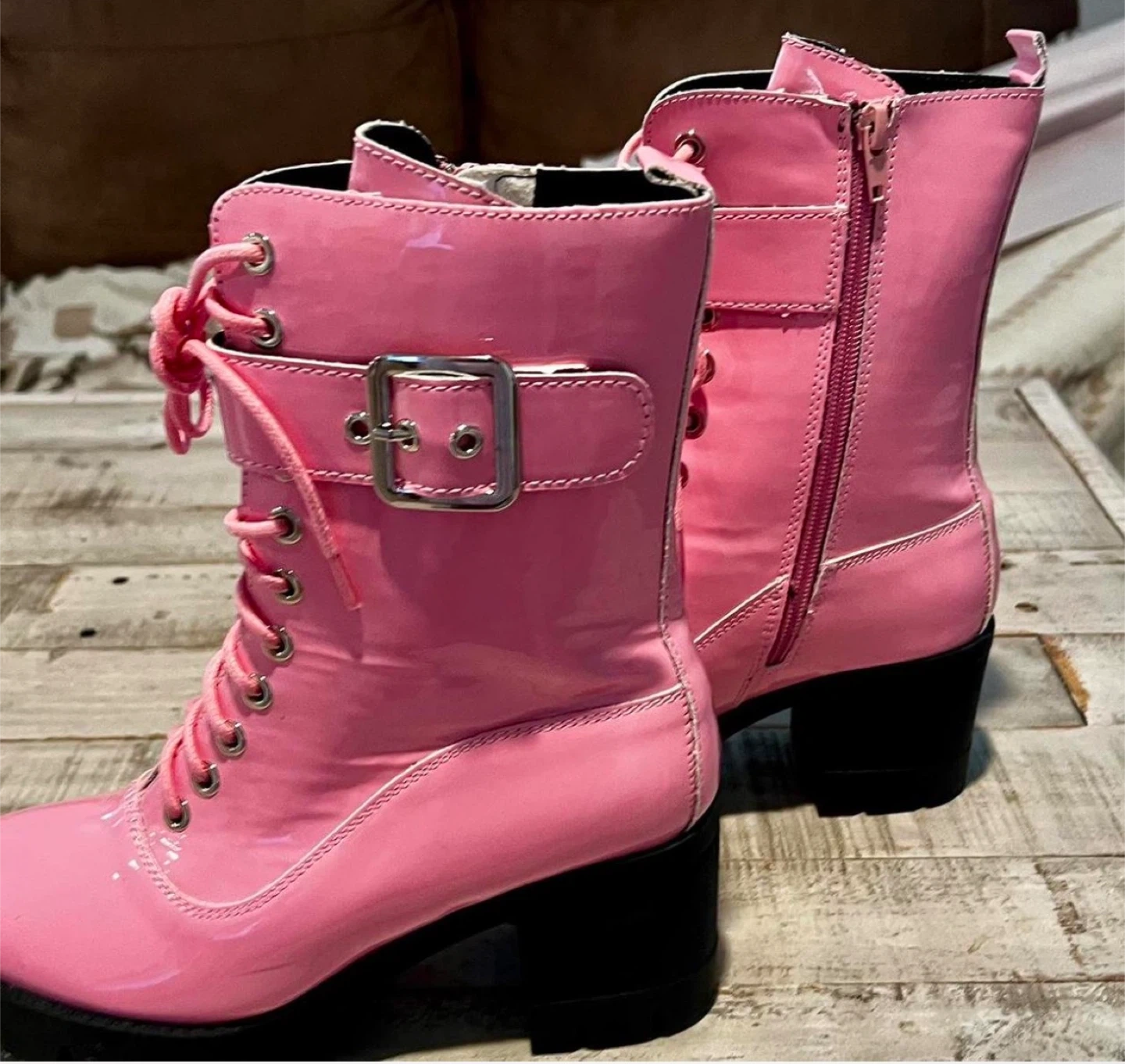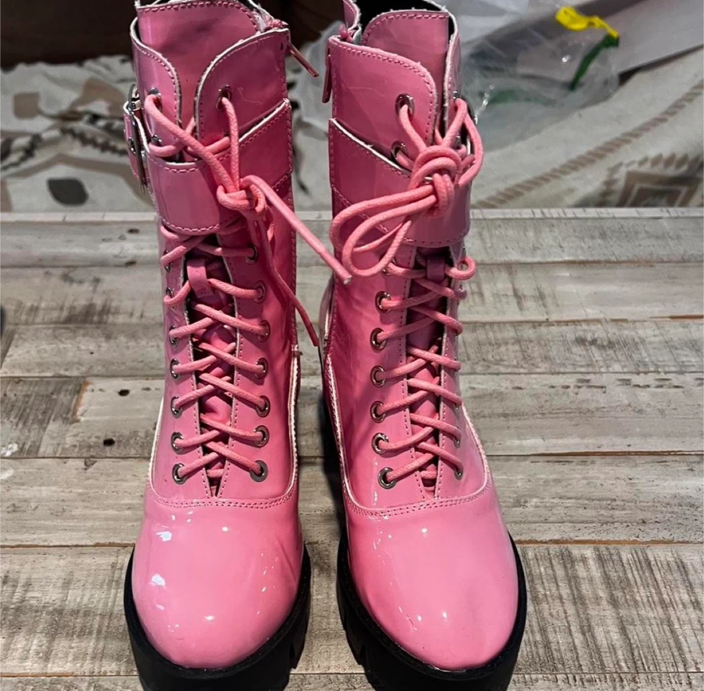 Buy & SellPink Patent Combat BootsPink Patent Combat Boots$15Faux patent leather, heeled (~2in) rubber sole. Side zippers, laces, and buckle details. Hardly worn. Purchase with any other listing for 25% off!WHERE TO MEETDitmars Steinway IntersectionView MapSELLERverifiedEugeniaDitmars Steinway681 review0 chats·1 favorites·85 viewsSEND CHAT TO SELLERHi Eugenia! I’m interested in your listing.Hi Eugenia! I’m interested in your listing.Get the Karrot app to chatSign In to chat