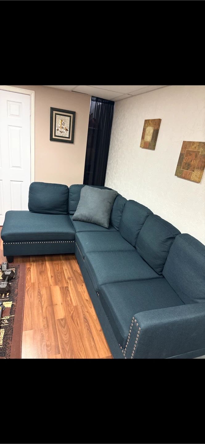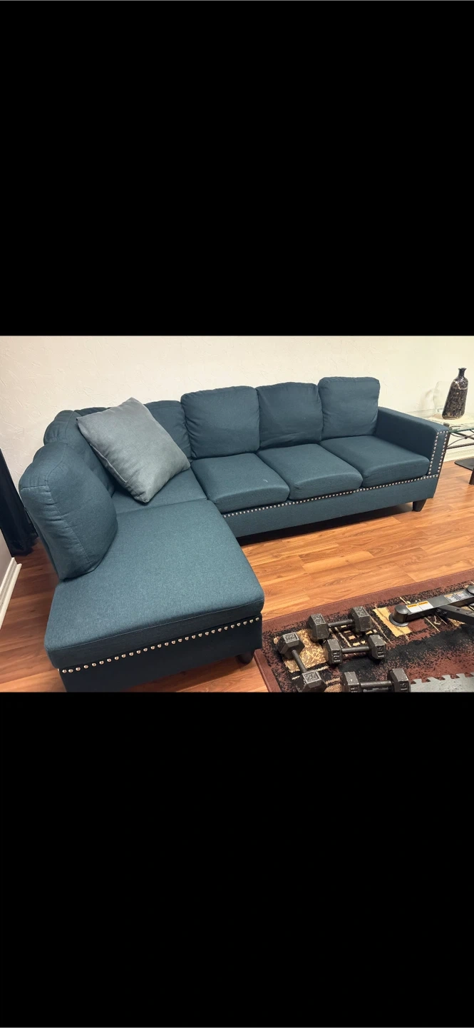 Blue upholstered sectional sofa. It features decorative nailhead trim and includes one accent pillow.