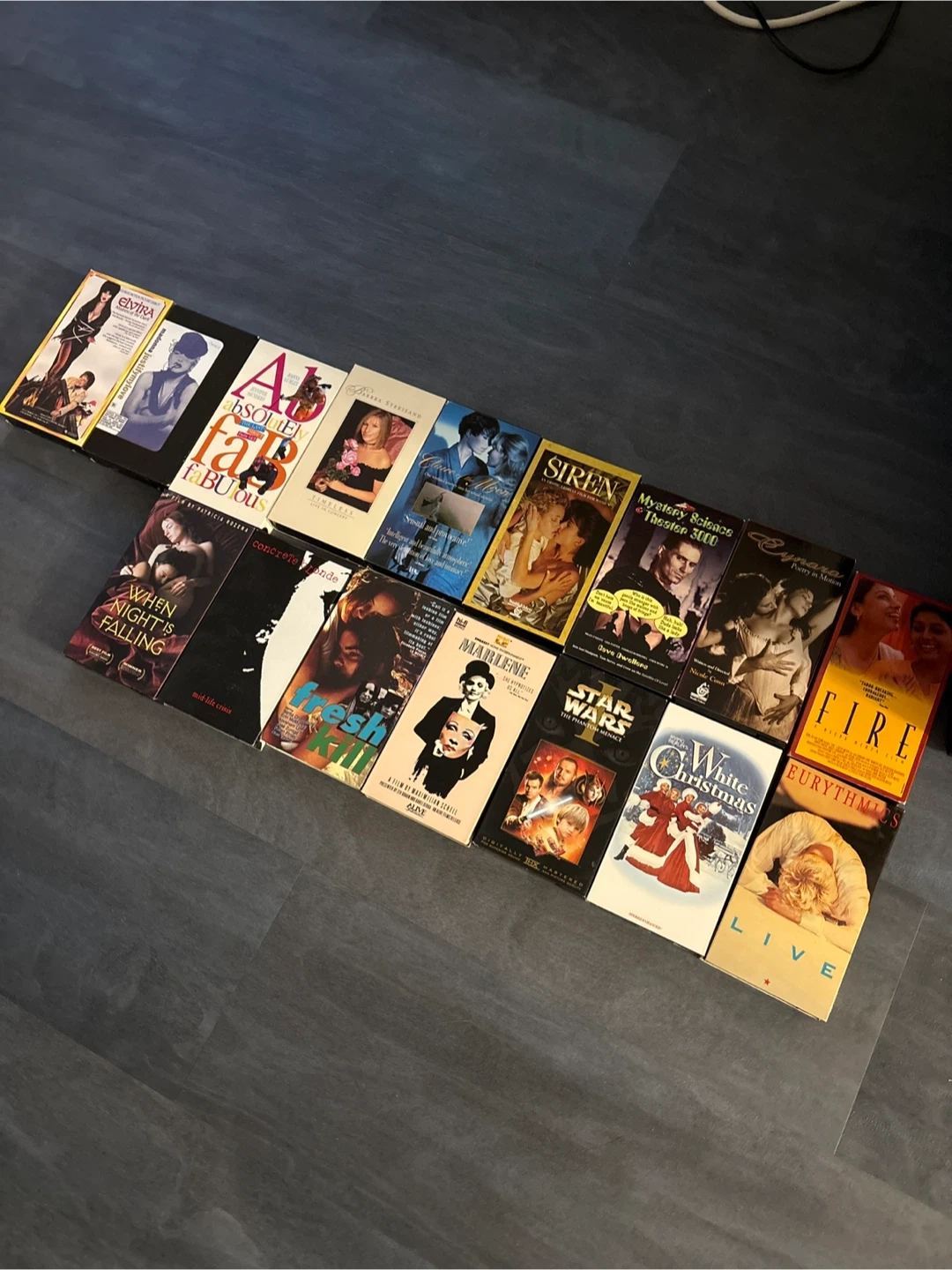 A collection of various VHS movies. Titles include Elvira, Absolutely Fabulous, Siren, Star Wars, and more. Great for collectors or movie buffs who enjoy retro media! Some boxes may show wear.