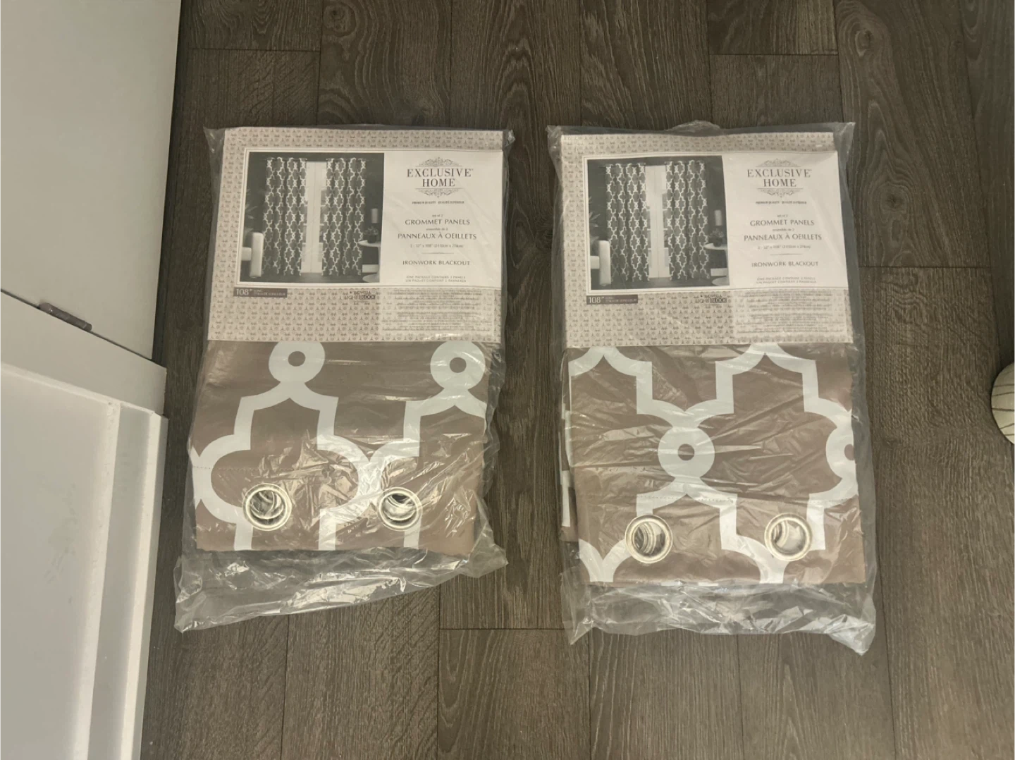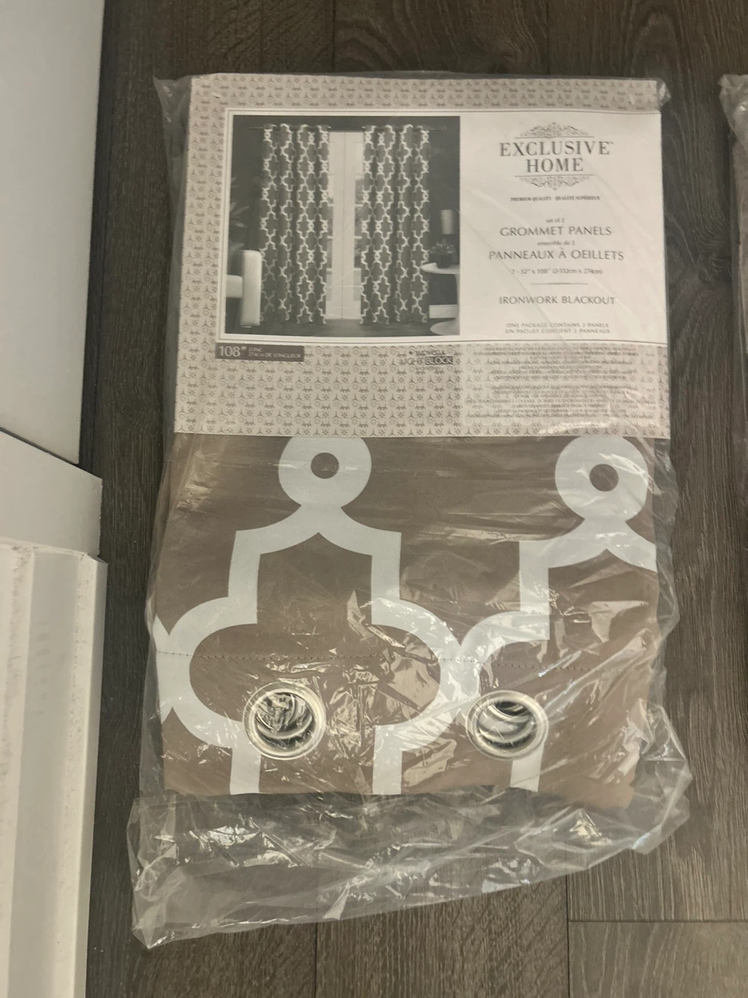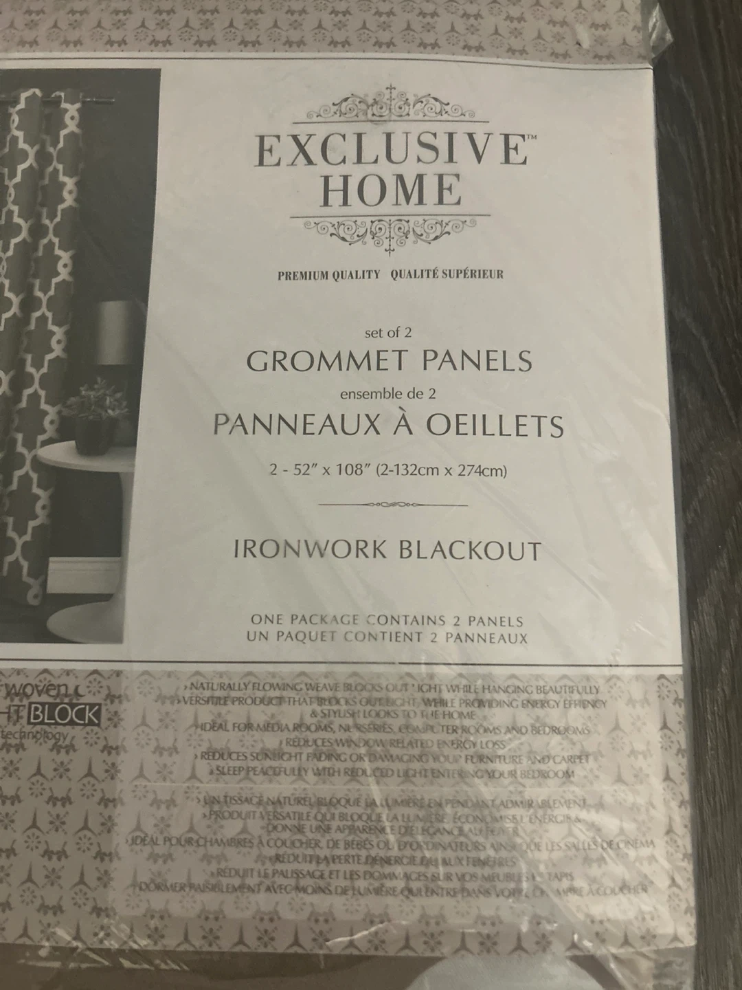 PRICE IS FOR EACH NOT BOTH! Selling a set of two Exclusive Home Ironwork Blackout grommet panels. These are premium quality curtains, each panel measuring 52" x 108" (2-132cm x 274cm). They're designed to naturally flow and weave, blocking out light while providing energy efficiency. These panels are ideal for media rooms, nurseries, and bedrooms, reducing some outside noise and energy loss. They help you sleep peacefully with reduced light entering your bedroom. One package contains two panels.