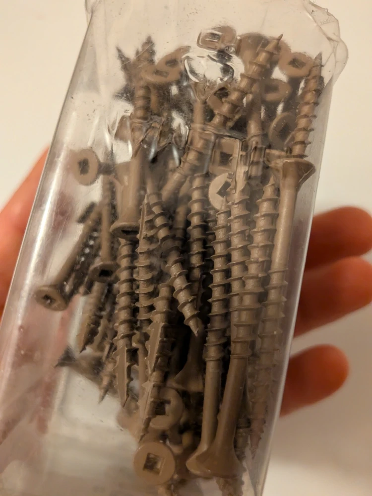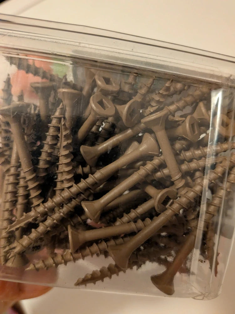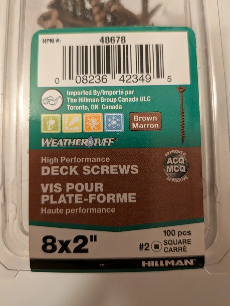 Selling a container of Hillman High Performance Deck Screws. They are brown and measure 8x2". There are 100 pieces in the container