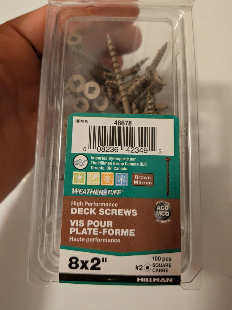 Selling a container of Hillman High Performance Deck Screws. They are brown and measure 8x2". There are 100 pieces in the container