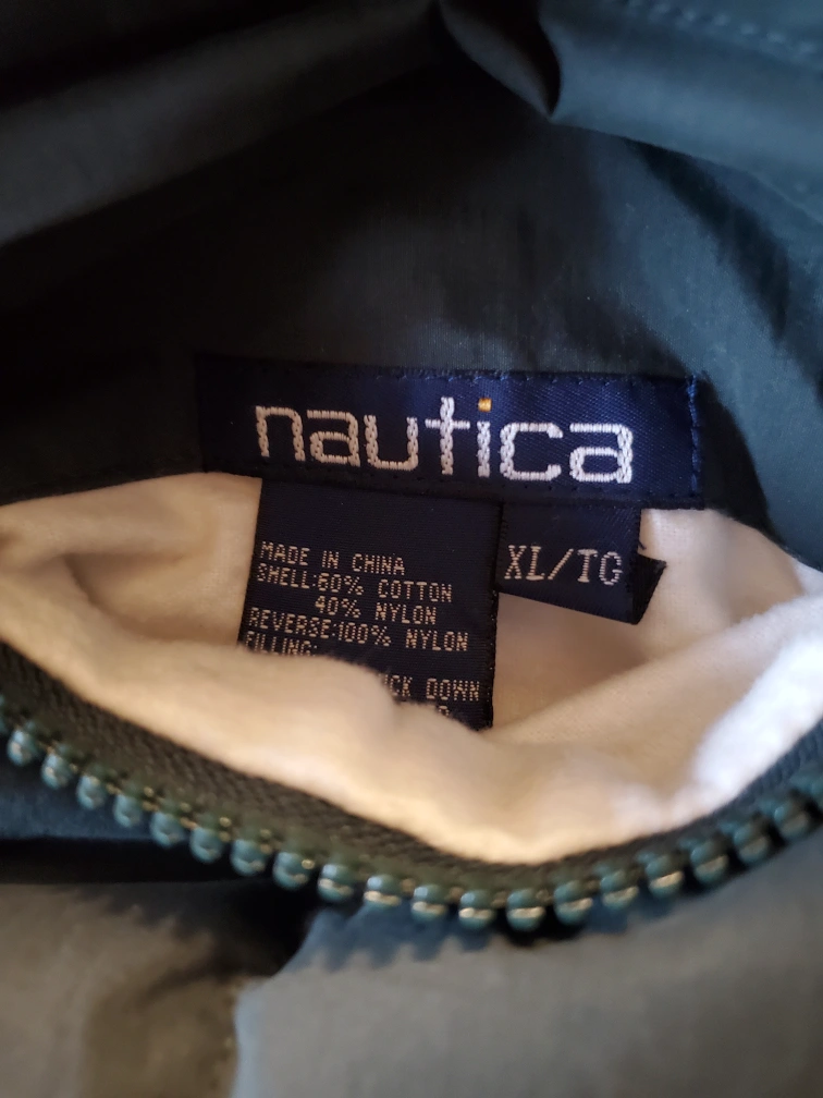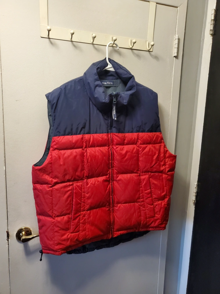 Men's Nautica puffer vest. Size XL/TG. Red and dark green colour-blocked design. Shell: 60% cotton, 40% nylon. Reverse: 100% nylon. Filling: duck down.