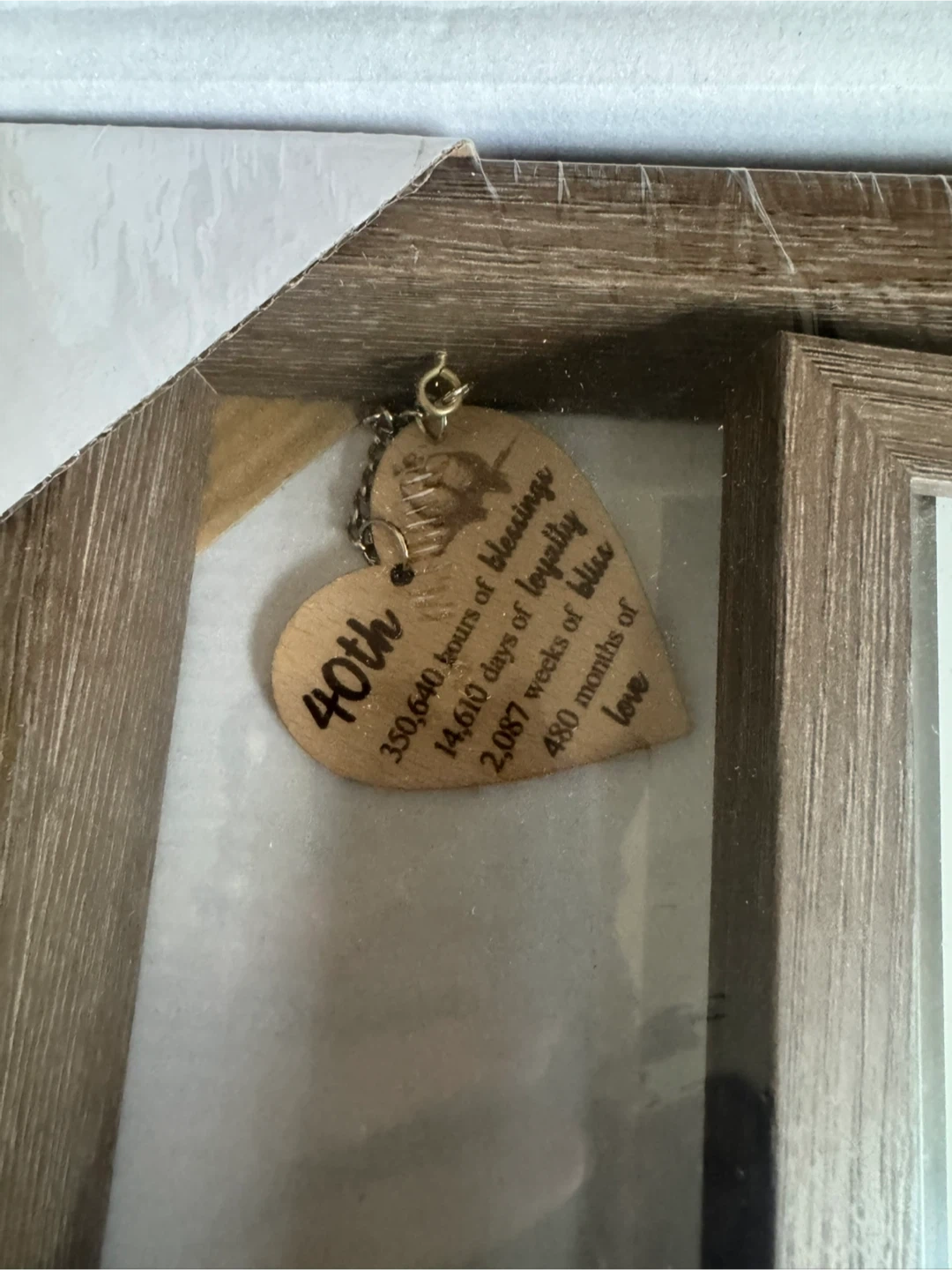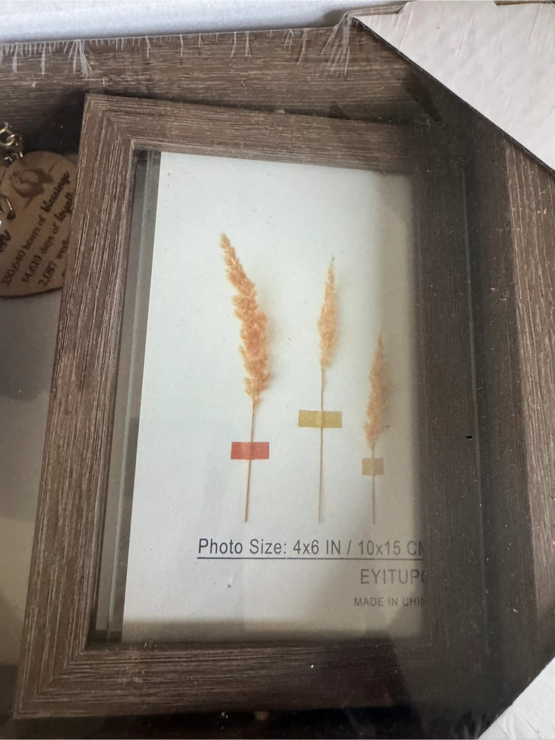 I'm selling a rustic-style picture frame that holds a 4x6 inch photo. It's brand new and still in its original box!