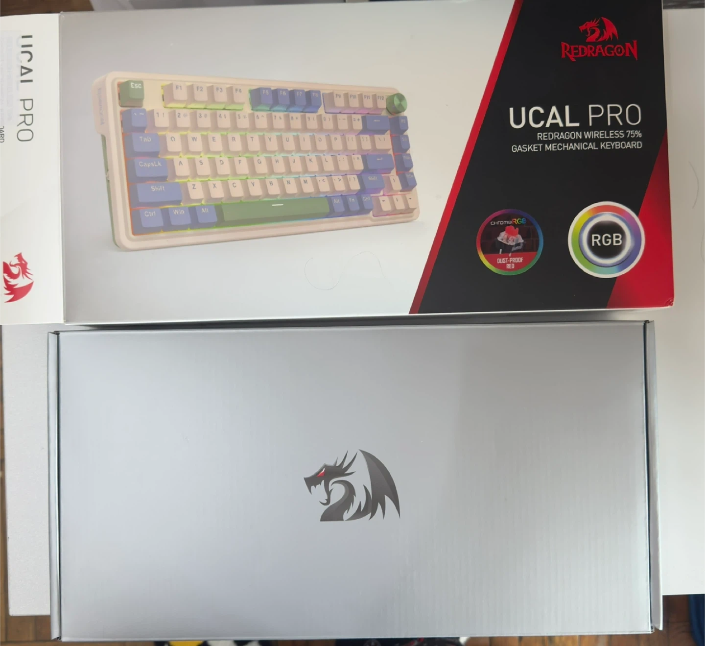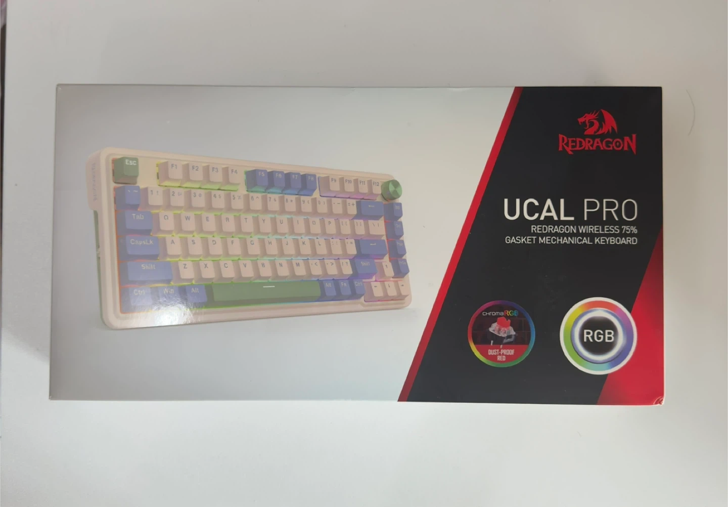 This is a Redragon UCAL PRO wireless 75% gasket mechanical keyboard. It features a unique beige, blue, and green keycap colourway. The keyboard comes with its original box and all accessories. It's a dust-proof RGB mechanical keyboard.