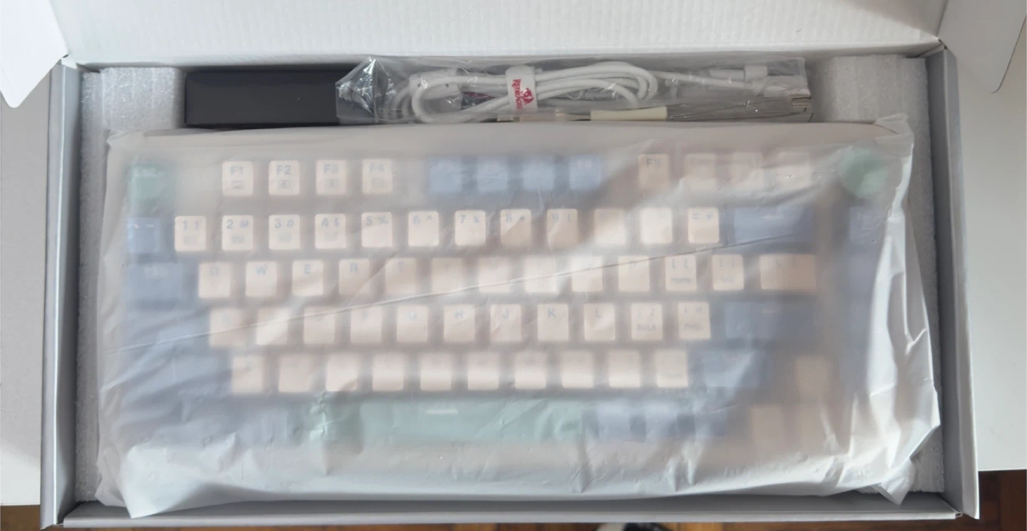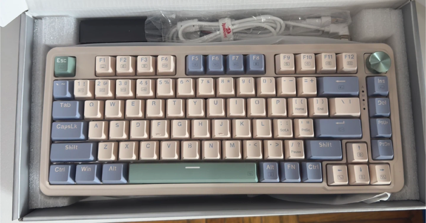 This is a Redragon UCAL PRO wireless 75% gasket mechanical keyboard. It features a unique beige, blue, and green keycap colourway. The keyboard comes with its original box and all accessories. It's a dust-proof RGB mechanical keyboard.