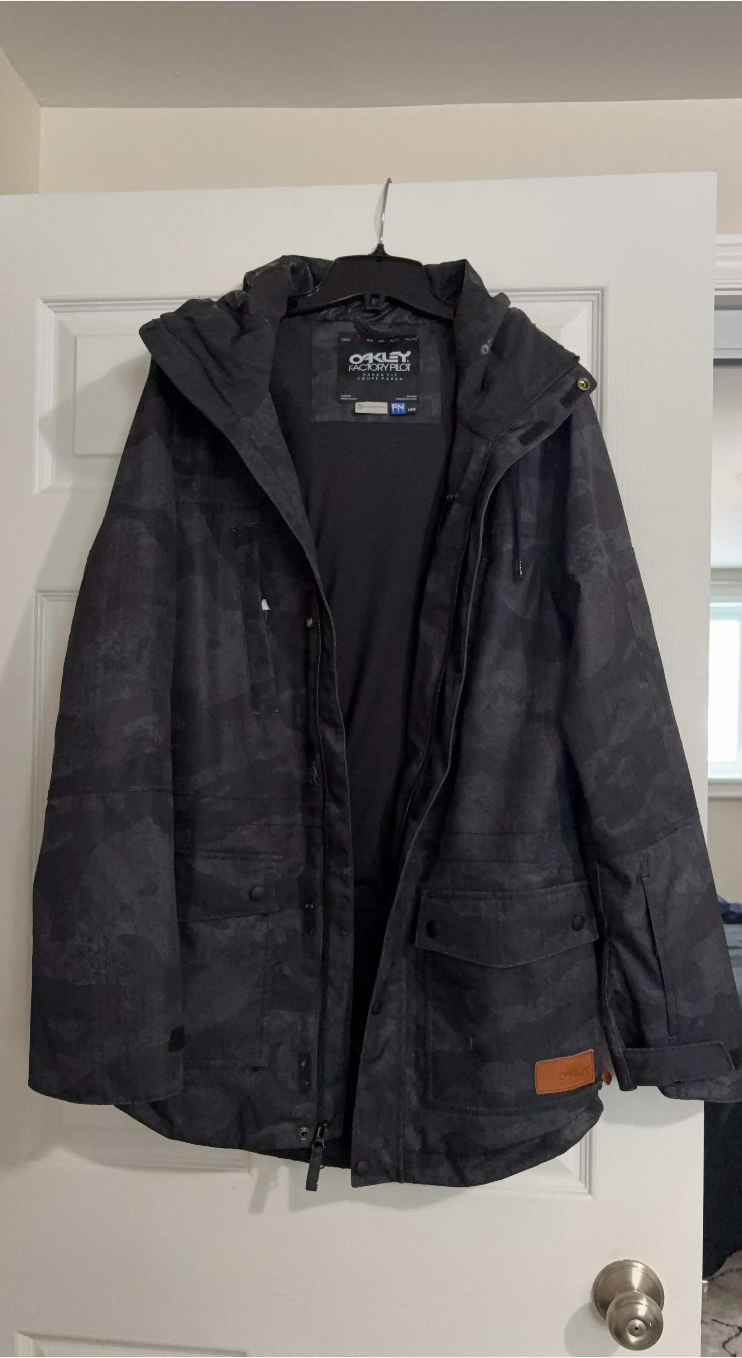 Oakley Factory Pilot Coupe Parka in great condition! This softshell parka features a stylish camo pattern and the iconic Oakley logo. Perfect for staying warm and dry during outdoor activities.