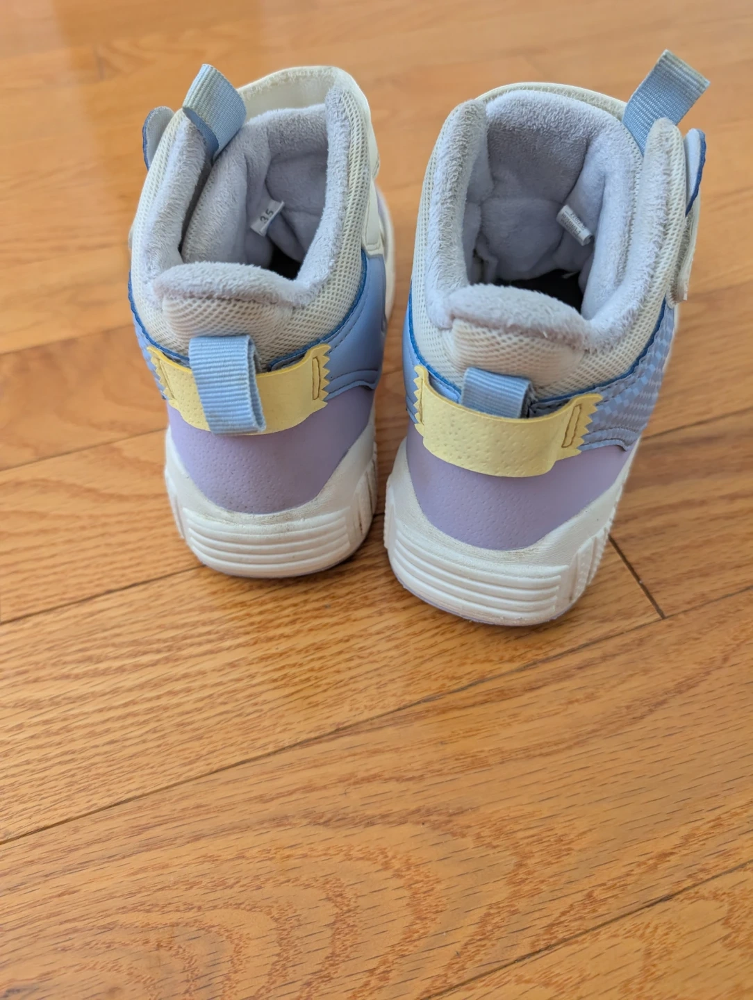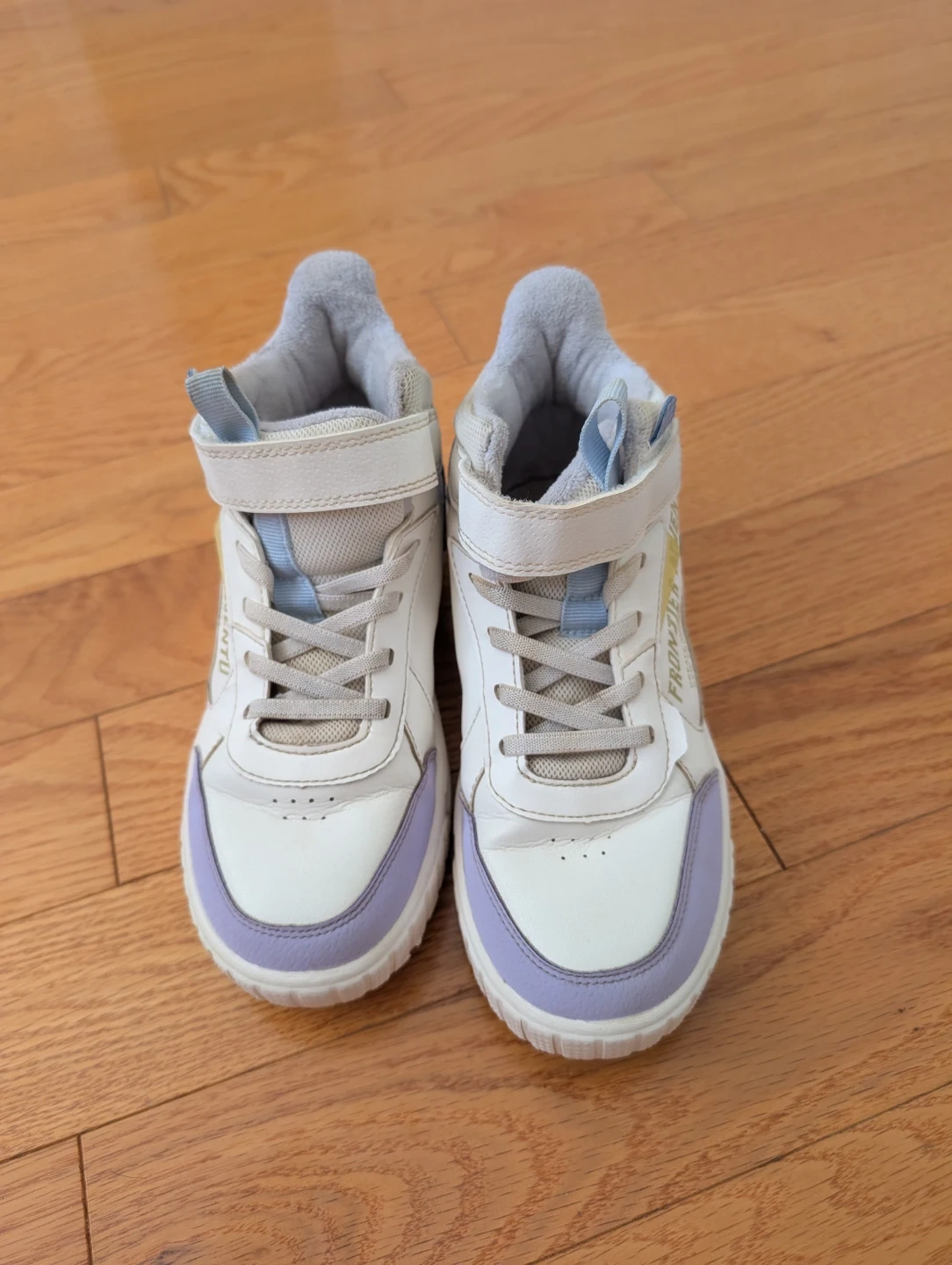 These white, light blue, and purple high-top sneakers are from Frontier Adventu. Size 35. These shoes are perfect for active kids ready for any adventure!