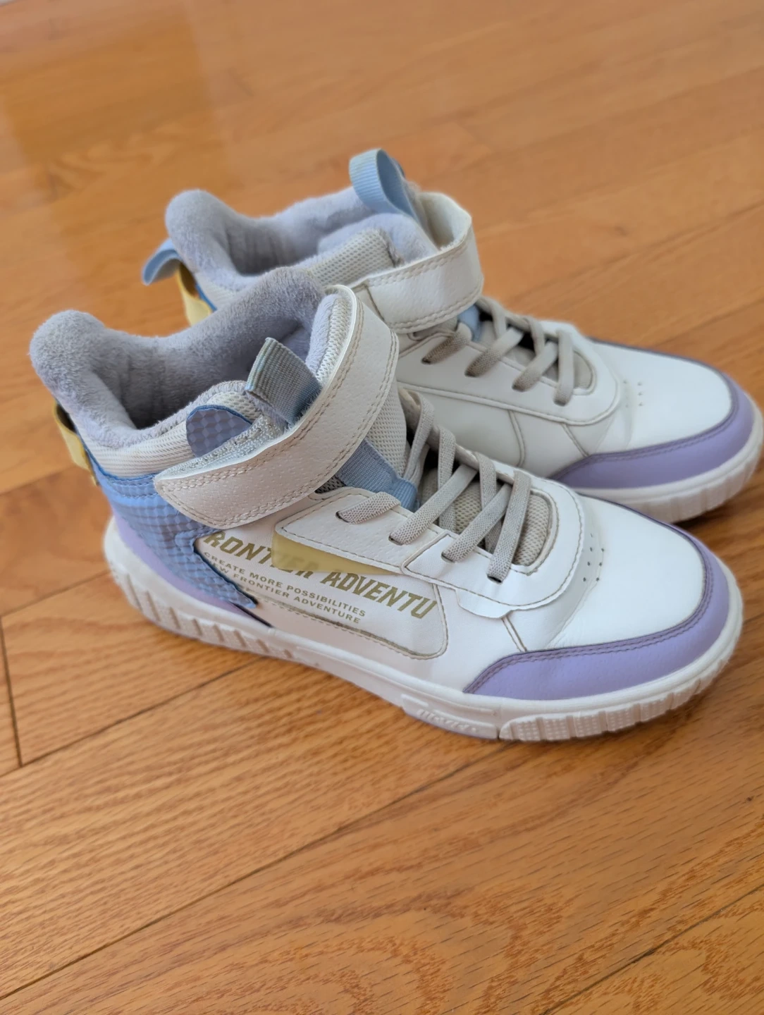These white, light blue, and purple high-top sneakers are from Frontier Adventu. Size 35. These shoes are perfect for active kids ready for any adventure!