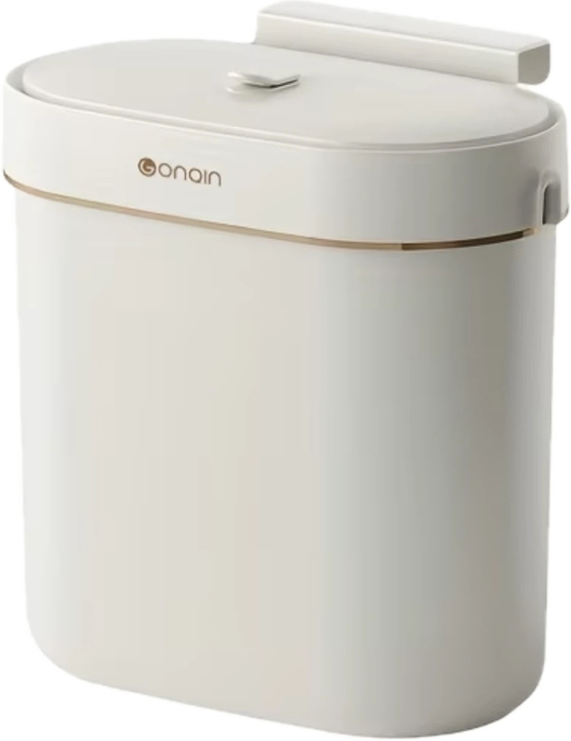 9-litre hanging trash can in white. Made of plastic and measures 28x28x15cm. Two installation methods are included: suspended or hanging. Hanging applicable when the cabinet door thickness is less than or equal to 2.5cm (fits most cabinet doors). Brand new.