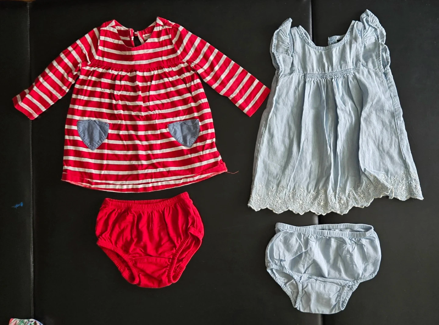 Dresses: Red striped dress and Blue chambray floral dress (both with matching bloomers, 6-12 months)