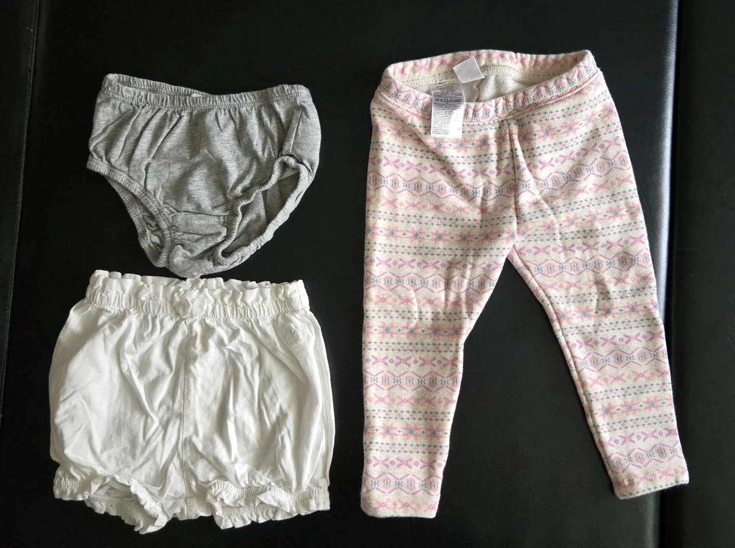 Basics: Fair Isle print leggings, white ruffled bloomers, and grey diaper cover. (18-24 months)